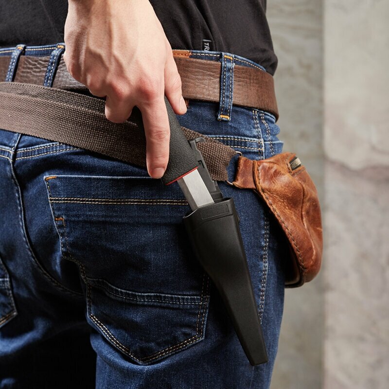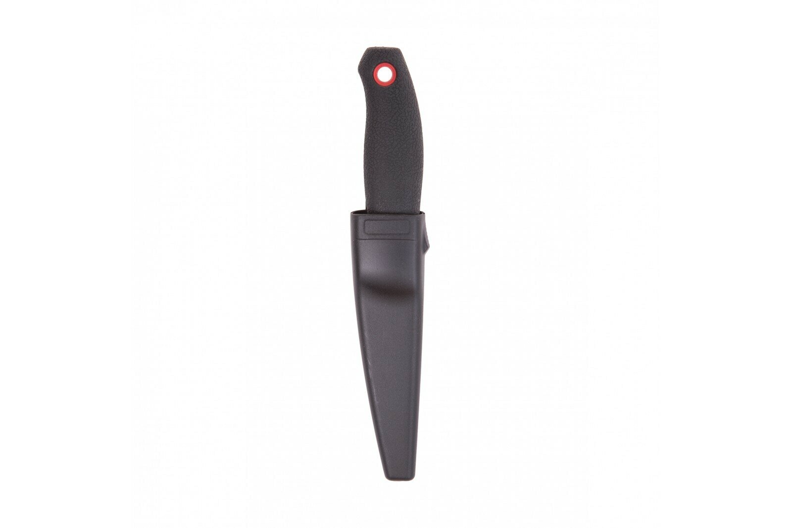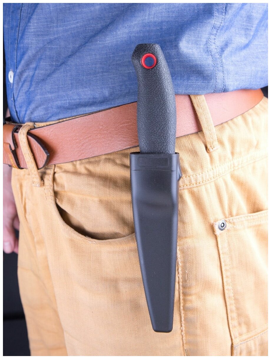 Нож идет в комплекте с пластиковым чехлом, который удобно крепить к одежде.