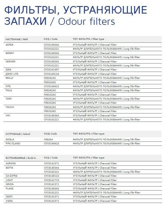 | Для вытяжек | Elica: Berlin, Missy/ Jetair: Gaia |