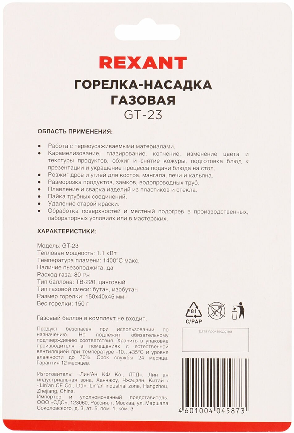 Горелка газовая Rexant GT-23 / 12-0023