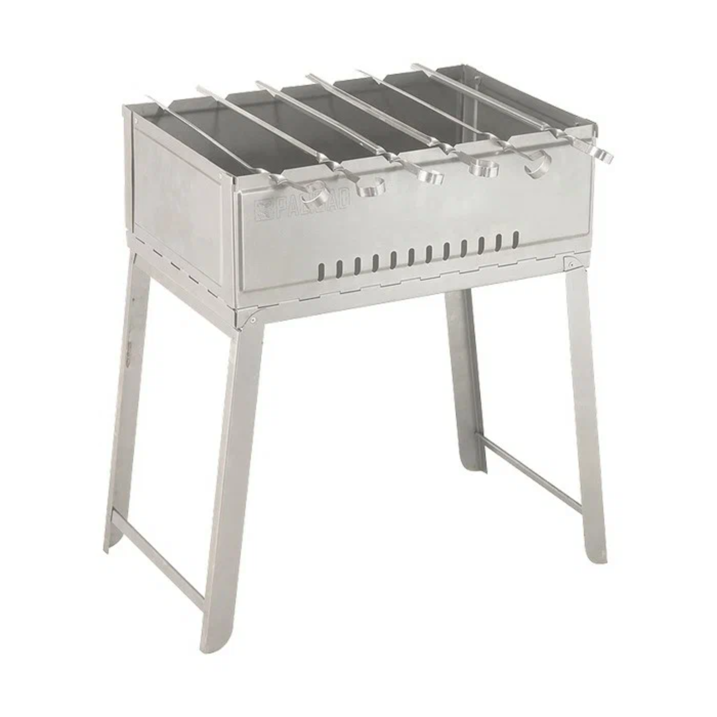 Шесть шампуров из нержавеющей стали, которые входят в комплект, складываются внутрь мангала.