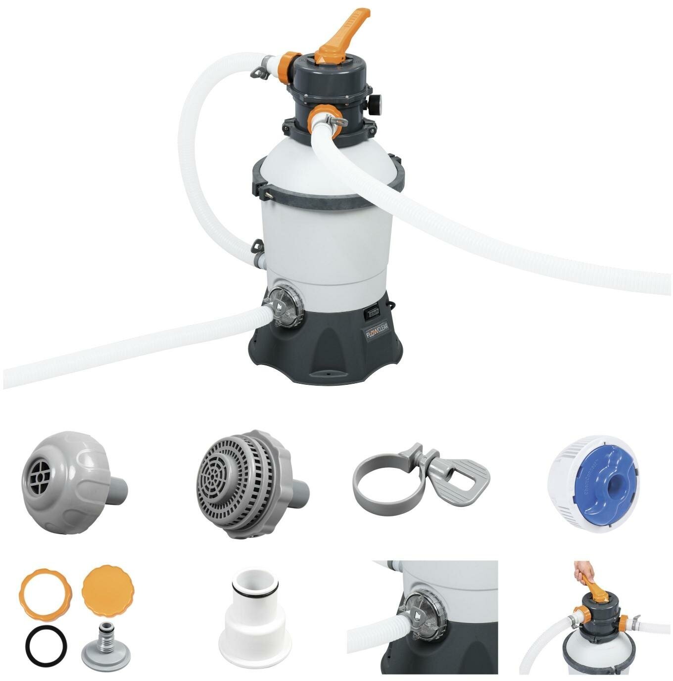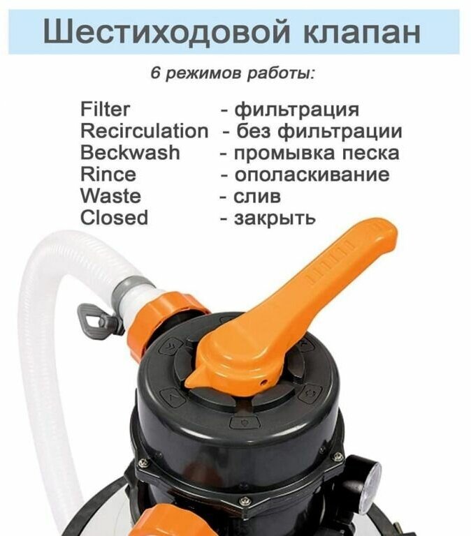 Песочный фильтр насос для бассейна Bestway предназначен для механической очистки воды в бассейне. В качестве фильтрующего элемента используется специально просеянный кварцевый песок (0,45-0,85 мм). Фильтрующая установка комплектуется насосом, шестипозиционным клапаном переключения режимов работы, манометром для индикации давления в системе.