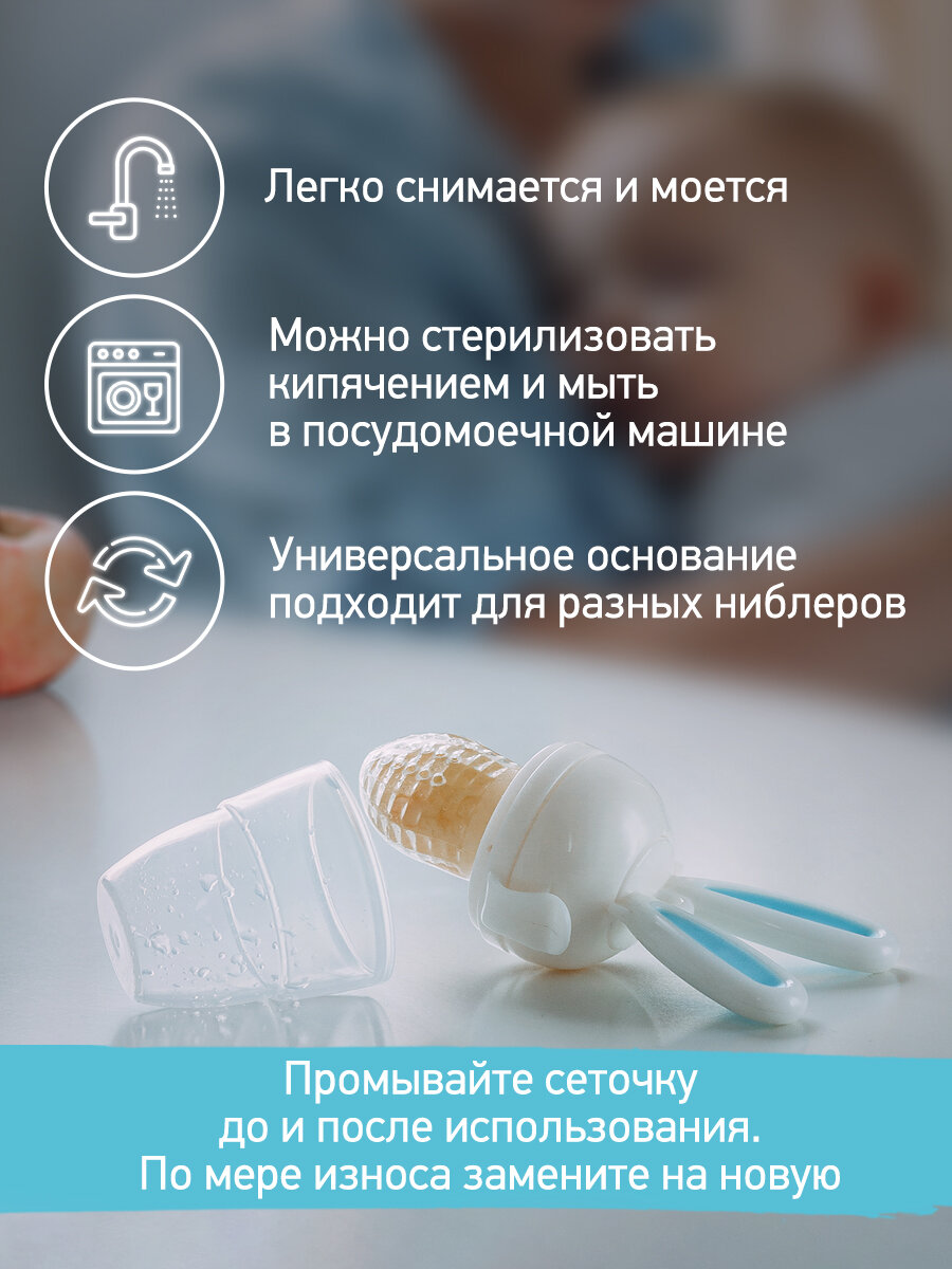 Кроме того, ниблер с силиконовой сеточкой способен уменьшить боль при прорезывании зубов. Для этого нужно поместить в него охлажденные кусочки яблок, груш или моркови. Упругий материал сеточки будет массировать десны малыша, снимая болезненные ощущения.