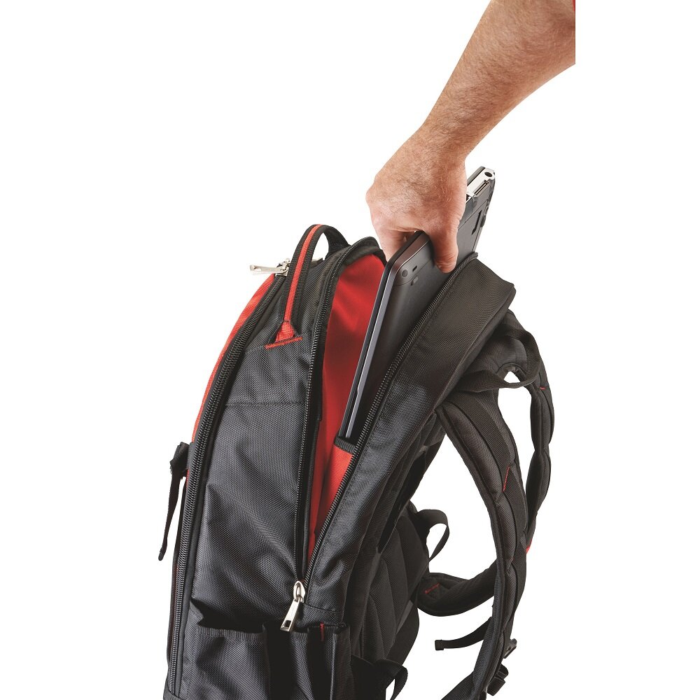 Прочная конструкция, изготовлены из 1680D баллистического нейлона. Жесткое литое основание позволяет рюкзаку стоять вертикально и защищает в любых погодных условиях. Мягкие, дышащие лямки для эргономичной, комфортной транспортировки. Большой объем - 35 карманов в общей сложности. Складной передний карман для легкого доступа и хранения крупных предметов. Боковой карман для бутылки воды. Вертикальная стенка для крепления инструмента и принадлежностей освобождает пространство для хранения мелких принадлежностей. Карман для безопасного хранения ноутбуков / планшетов и предметов личного пользования. Внешняя застежка на липучке фиксирует лямки для хранения.