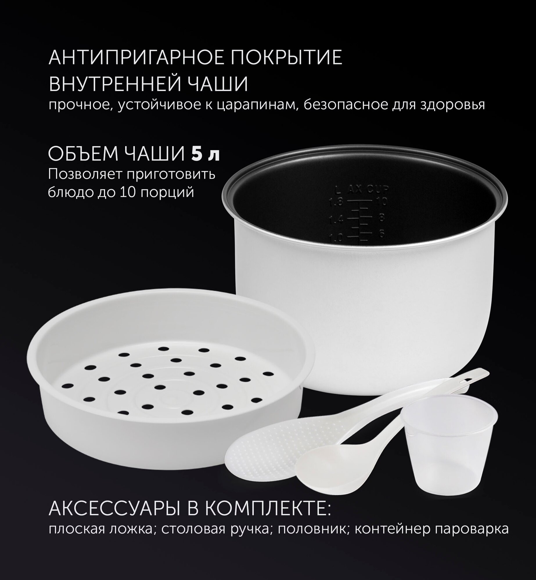 | Комплект поставки | Мультиварка, кабель питания, мерный стакан, контейнер для приготовления на пару, книга рецептов, чаша, столовая ложка, плоская ложка, документация |