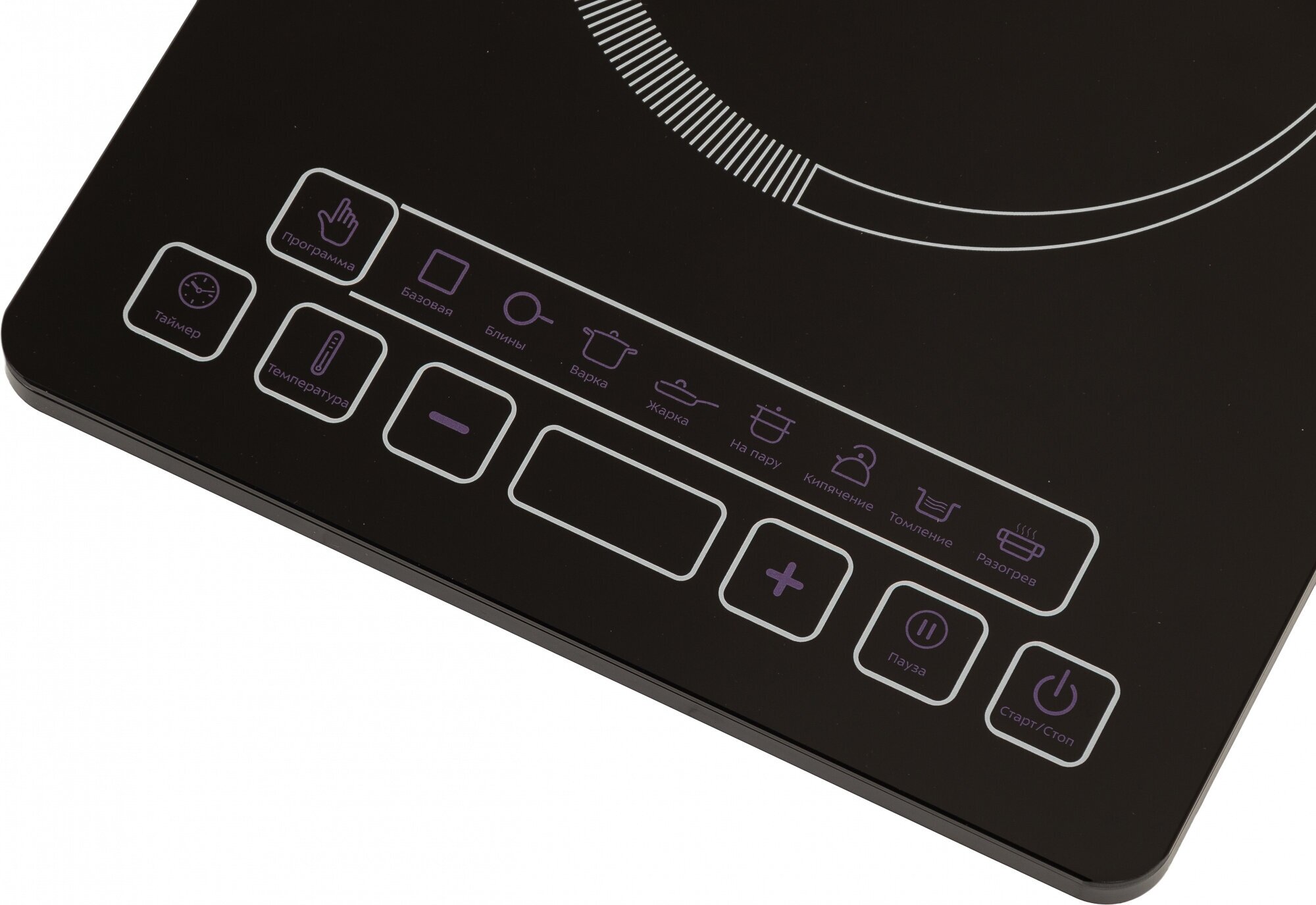 Плитка имеет 8 автоматических программ: каша, варка, разогрев, на пару, кипячение, жарка, мясо; и 1 базовую программу, где вы можете сами задать настройки приготовления.