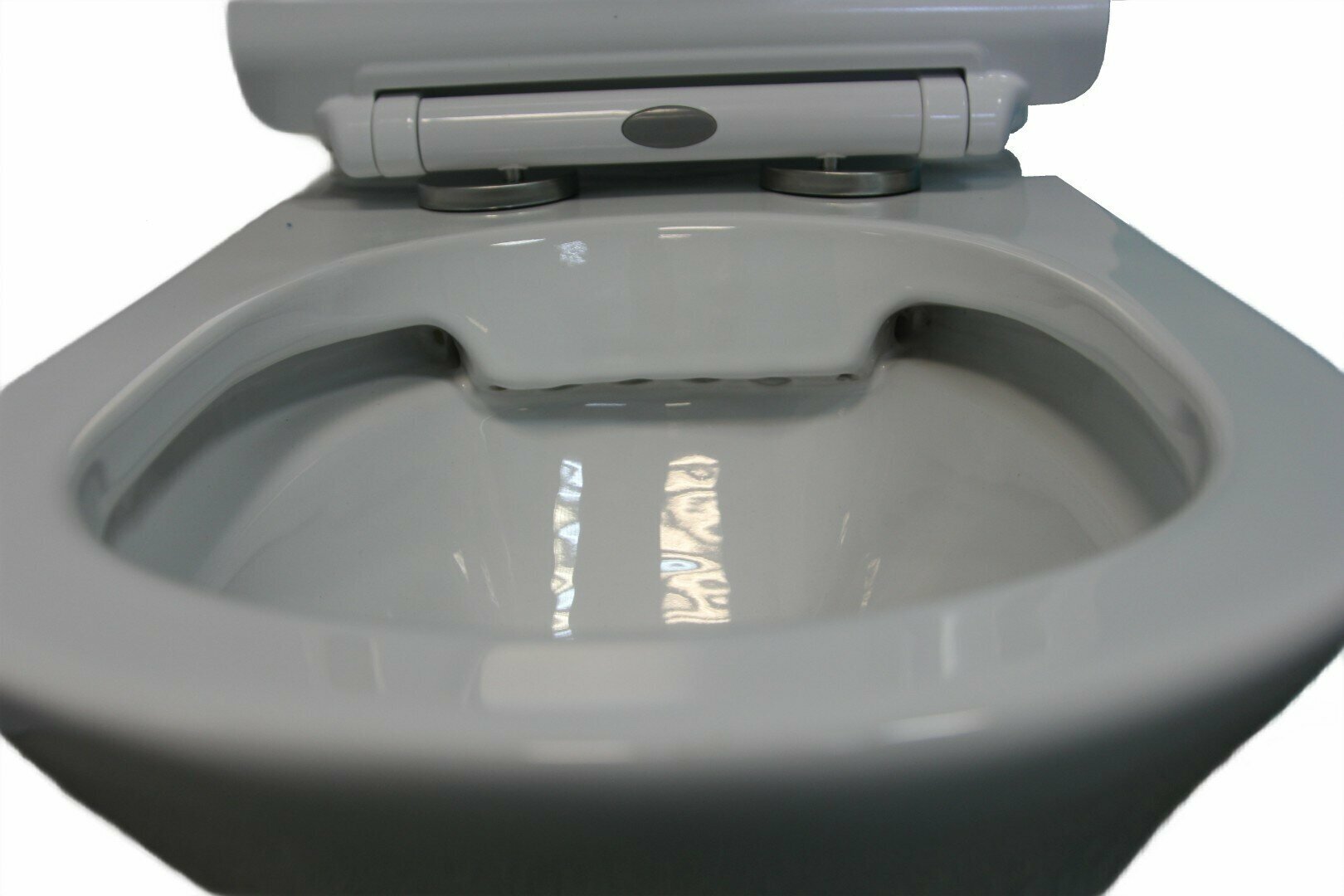 Пристенный , безободковый унитаз из фаянса со сливным бачком и чашей.