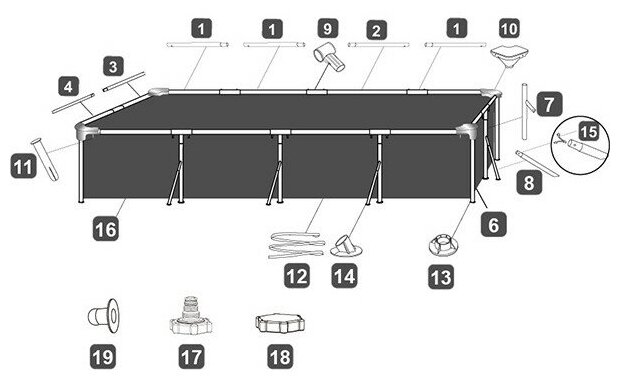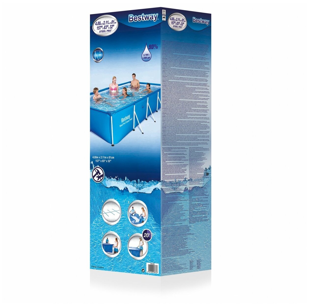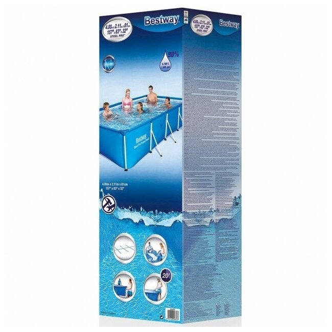 Каркасный прямоугольный бассейн Bestway отличается высокой прочностью и устойчивостью. Чаша выполнена из высококачественного трехслойного ПВХ: два слоя плотного винила и один - полиэстер для особой прочности. Каркас металлический нержавеющий оцинкованный. Не требует бетонирования и подготовки ямы, все, что нужно, это плоская, горизонтальная площадка. Сезонный бассейн (рекомендуется разбирать на холодное время года) обладает простой конструкцией - может быть легко разобран и собран заново. Время сборки и подключения бассейна не более 1-2 часов. Удобный сливной клапан позволяет присоединить садовый шланг, что дает возможность слить воду в любое место.