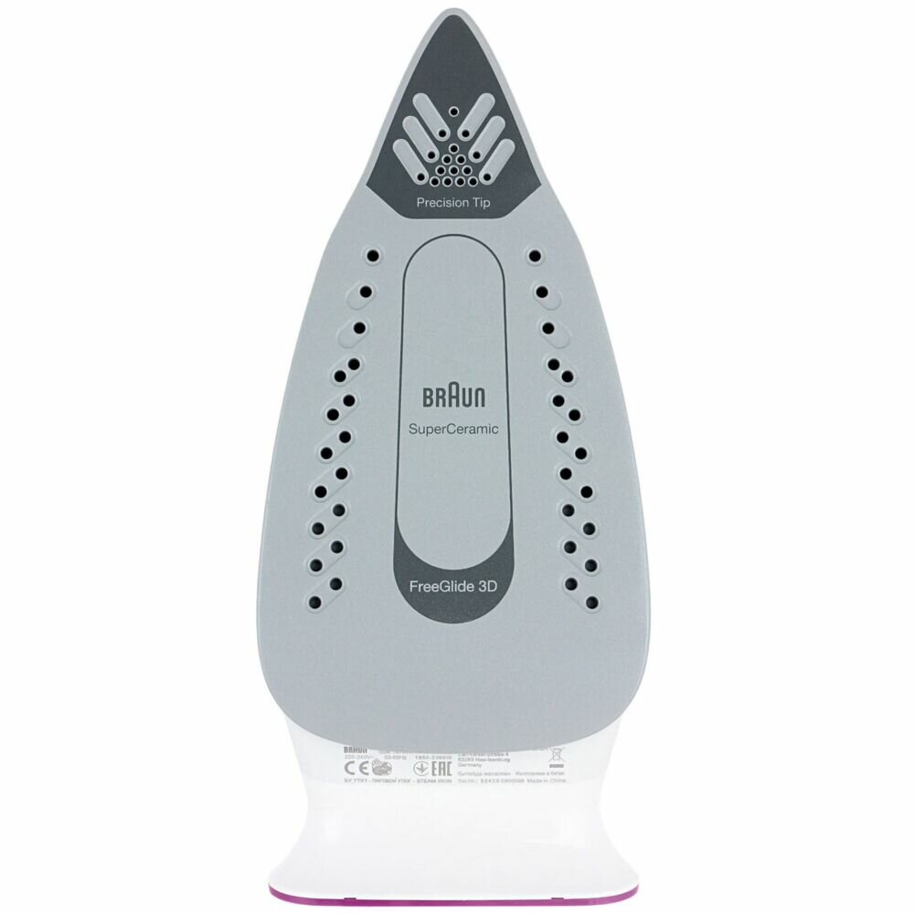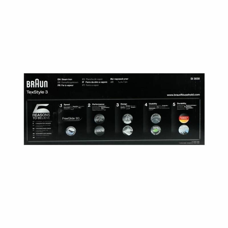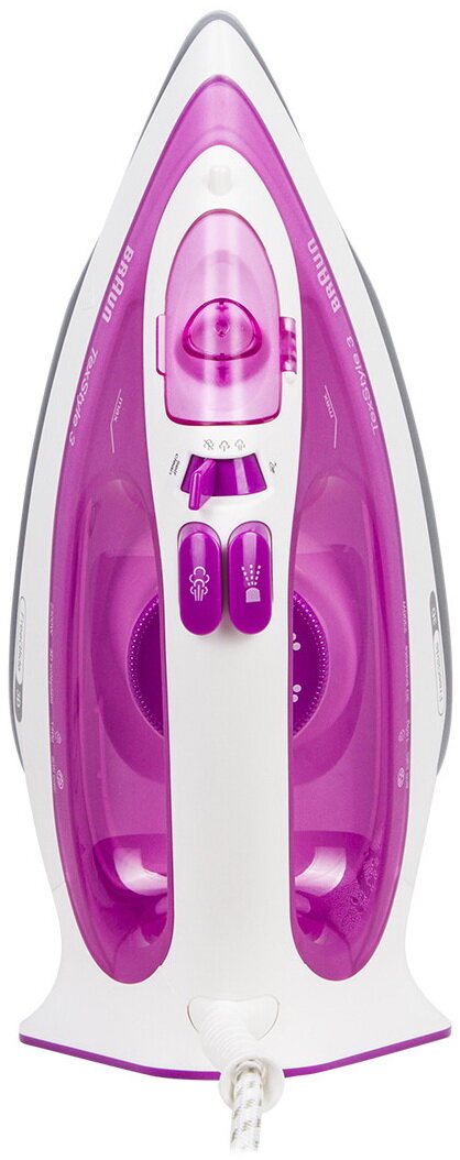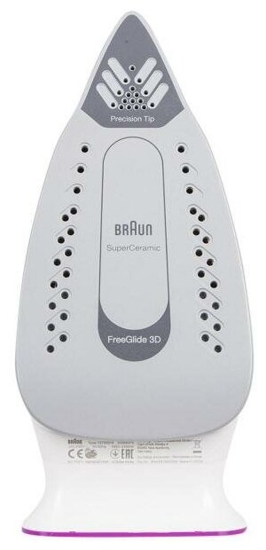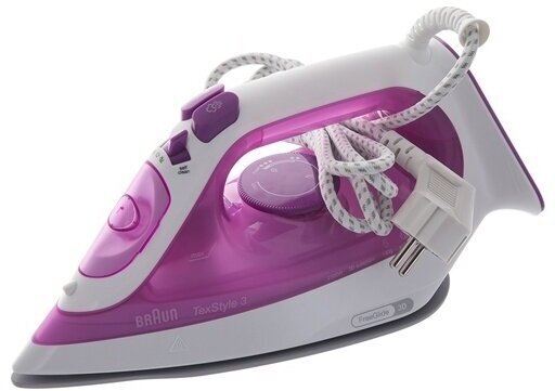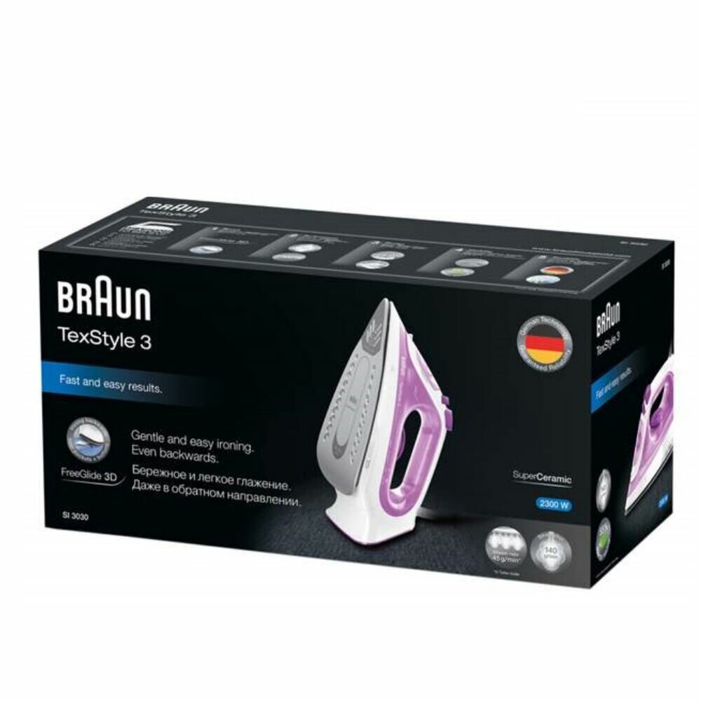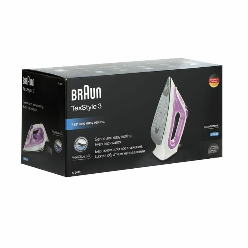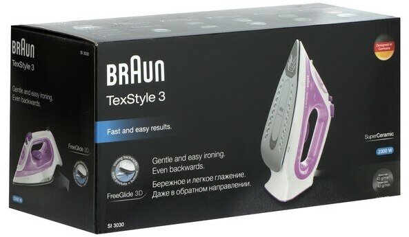 | Прочие особенности и свойства | Утюг Braun SI 3030 PU серии TexStyle 3. Мощность:2300 Вт. Инновационная, закругленная с задней стороны, подошва FreeGlide 3D изготовлена из керамики SuperCeramic (плавное скольжение на 360 градусов, без задевания пуговиц, карманов и молний). Паровой удар:140 г/мин. Регулируемая подача пара |