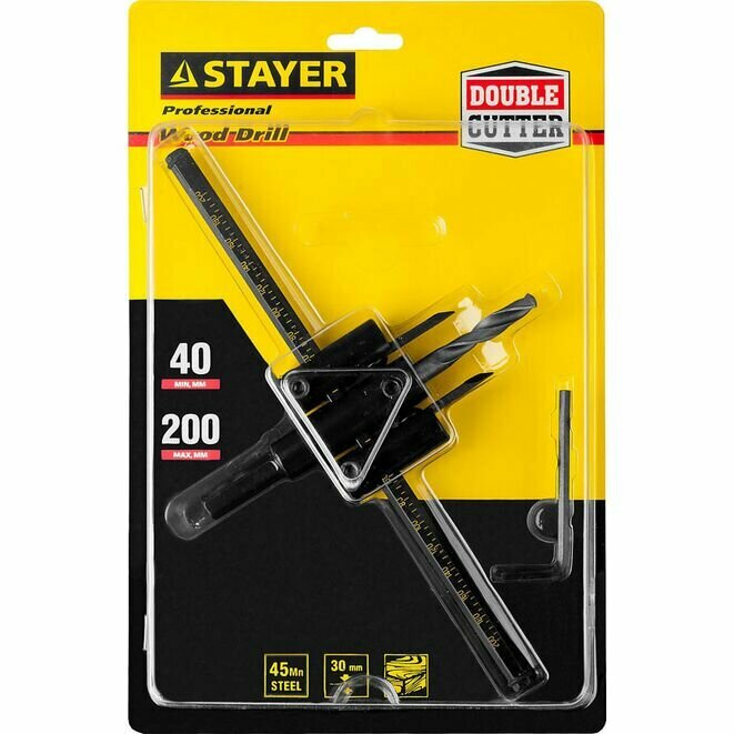 Сверло регулируемое "Балеринка" Stayer 2944-200 Ø 40-200 мм, HSS-R, быстрорежущая сталь М2(S6-5-2) Р6М5, класс А двухрезцовое, по дереву