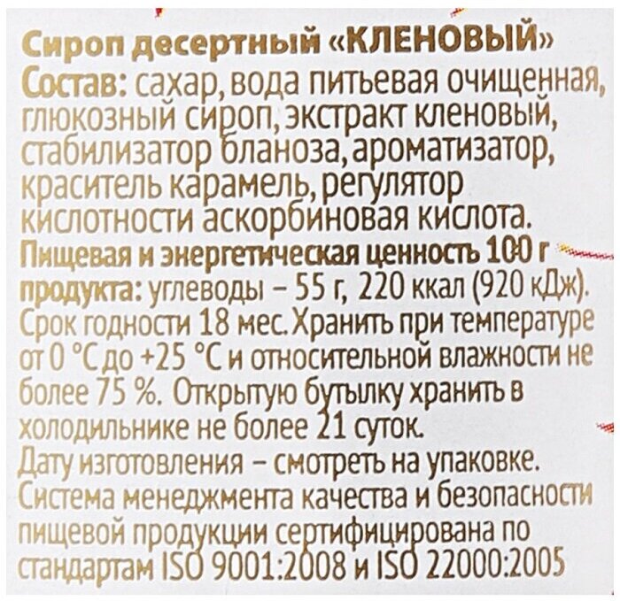 | Состав | сахар, вода питьевая очищенная, глюкозный сироп, экстракт кленовый, стабилизатор бланоза, ароматизатор, краситель карамель, регулятор кислотности аскорбиновая кислота. |