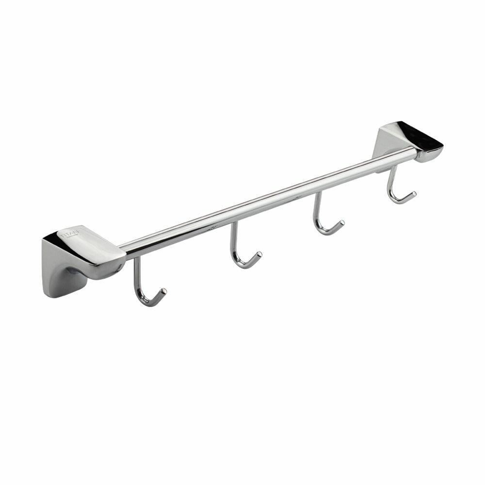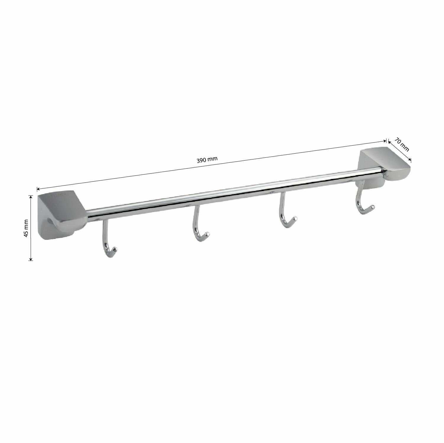 Держатель для полотенец металлический, хромированный, с четырьмя крючками. Материал изготовления — ЦАМ (цинк-алюминий-медь) + нержавеющая сталь. Хромированное покрытие очень стойко переносит истирания и обеспечивает зеркальный блеск изделия. На держателе с легкостью можно размещать вещи для сушки или вешать, как полотенца, так и одежду перед походом в душ. Идеально подойдет не только для ванной, но и для кухни, а также для дачи или гаража - при необходимости на держатель можно вешать любые предметы. Изделие крепится к стене с помощью дюбелей и саморезов (входят в комплект). Габаритные размеры: длина 390 мм, высота 45 мм, глубина 70 мм.