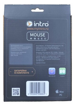 Беспроводная мышь Intro MW650 объединила в себе элегантный, утонченный дизайн, надежность и практичность. Внешне "грызун" напоминает манипулятор от Apple, Представленная модель позволит Вам избавиться от проводов и обрести максимальную свободу движений. За точное считывание перемещения практически на любых поверхностях, даже неровных, отвечает чувствительный оптический сенсор. Подключение к настольному компьютеру или ноутбуку производится при помощи ресивера, функционирующего на частоте 2.4 ГГц.