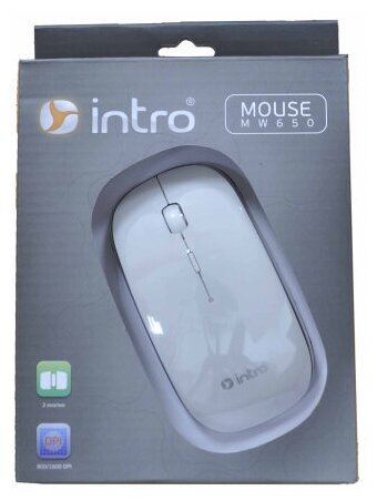 Intro MW650 - оптическая беспроводная радиомышь, работающая на частоте 2,4 ГГц. Ею легко управлять как правой, так и левой рукой благодаря изящному симметричному корпусу. Мышь позволяет изменять разрешение оптического сенсора: высокое разрешение 1600 dpi отлично подойдёт для игр, а разрешения 800 dpi будет вполне достаточно для прочих задач. Intro MW650 обладает компактными размерами и малым весом, поэтому легко поместится в карман сумки для ноутбука.