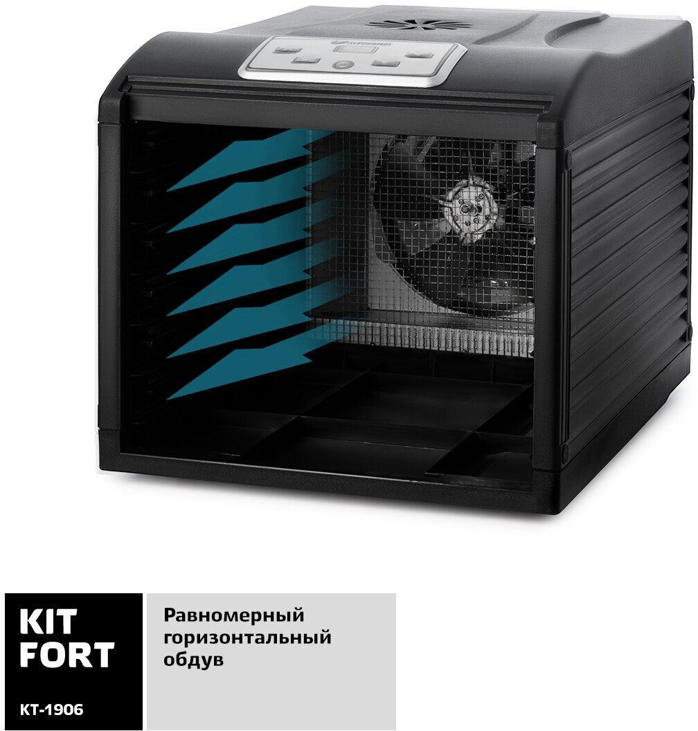 Сушилка оборудована большим мощным вентилятором, что обеспечивает равномерный горизонтальный обдув всех 6 поддонов. Поток воздуха направлен горизонтально, поэтому запахи продуктов с разных поддонов не смешиваются.