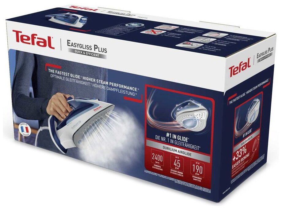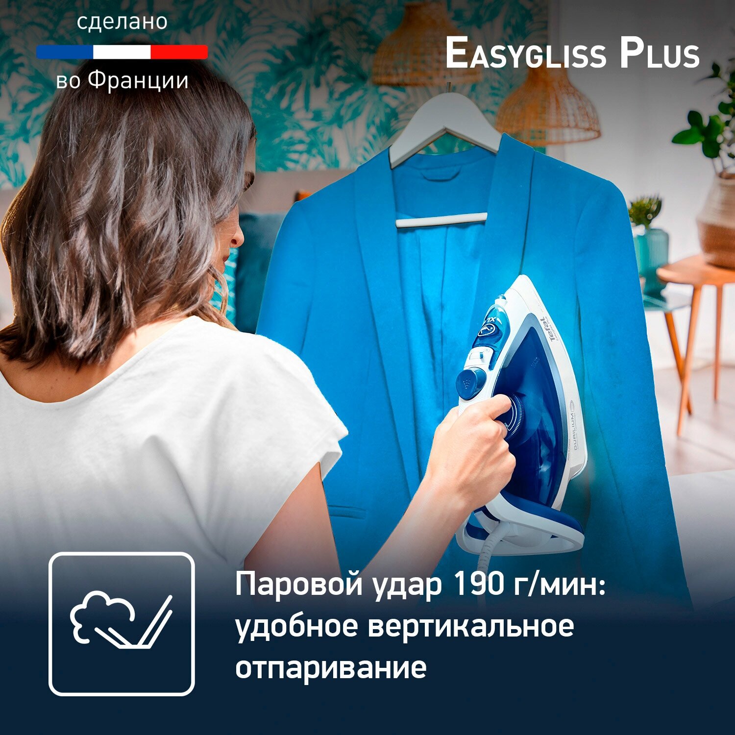 | Прочие особенности и свойства | Утюг Easygliss Plus сделает каждое глажение быстрым и легким благодаря ультратонкой подошве Durilium Airglide, которая идеально скользит по любому типу ткани, и высокой мощности 2400 Вт, благодаря которой утюг разогревается за считанные секунды. Мощность постоянного пара достигает 45 г/мин, позволяя эффективно гладить ваши вещи, а паровой удар до 190 г/мин помогает удалить самые стойкие складки. Утюг выполнен в практичном дизайне с удобным расположением отверстия для наполнения резервуара для воды, оснащен системой «Капля-стоп», которая предотвращает попадание капель воды на ткани во время глажения, и имеет активные паровые отверстия по всей поверхности подошвы, которые обеспечивают максимальное распределение пара |