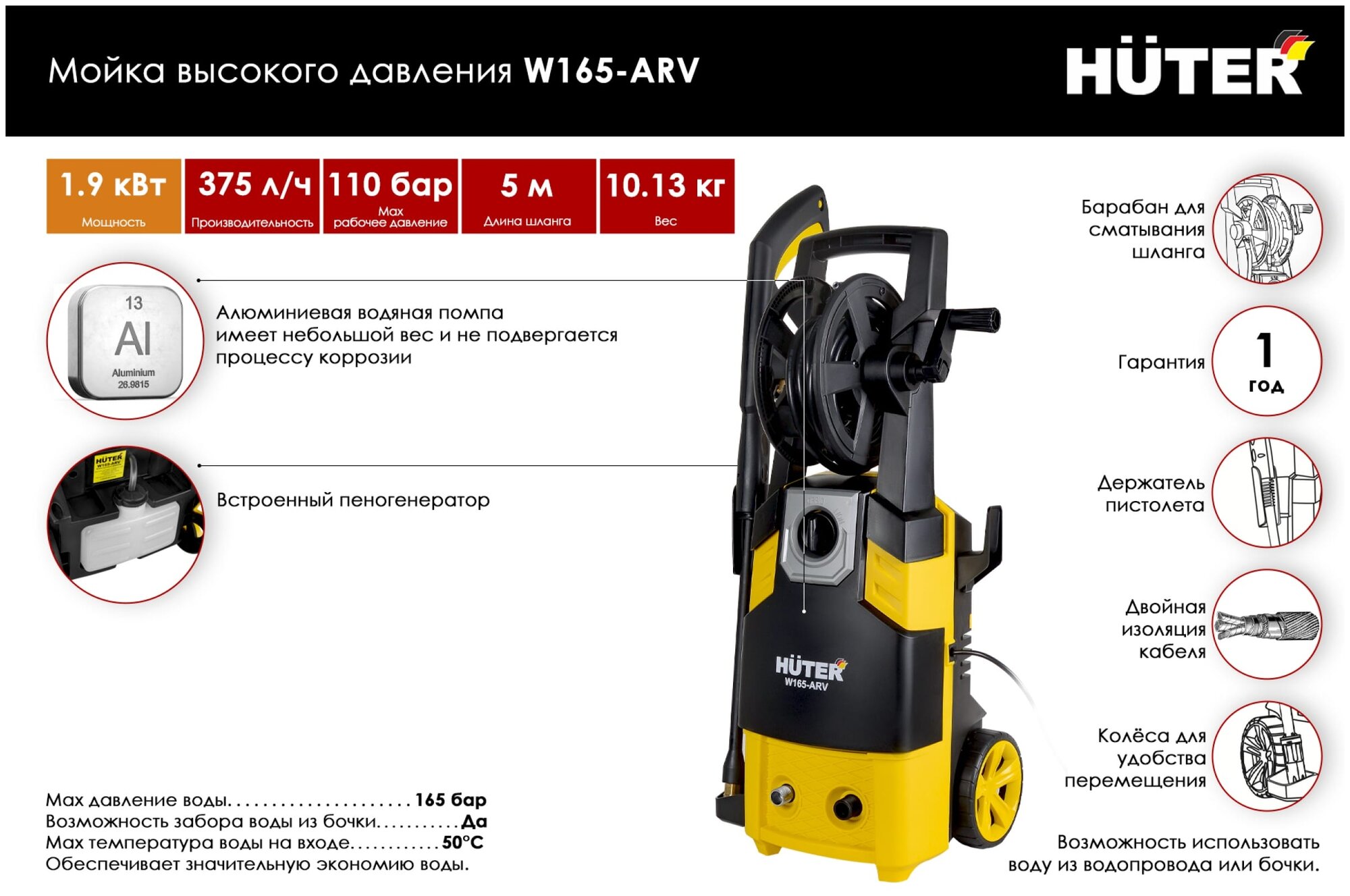 Мойка высокого давления HUTER W165-ARV оснащена мощным двигателем и способна создавать давление воды в 165 бар. Данное оборудование справится с самыми сильными загрязнениями за короткое время. Такой функциональный агрегат предназначен для использования в быту и на предприятиях (в качестве вспомогательного оборудования).