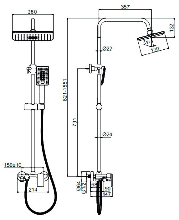 | В комплекте | верхний душ, штанга, смеситель, душевой шланг, лейка ручная |