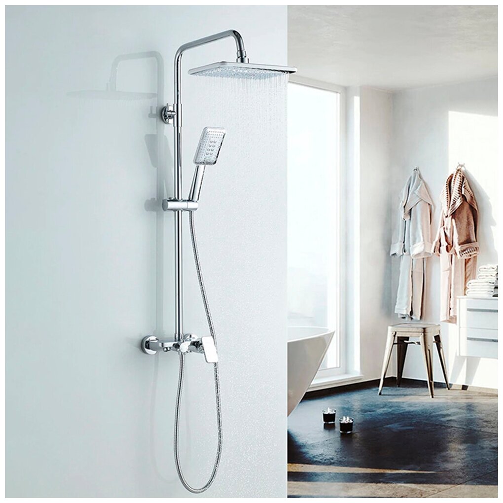- Комплектация: смеситель, душевая стойка, верхний душ, душевая лейка, душевой шланг, держатель для душевой лейки, настенный держатель, отражатели, эксцентрики