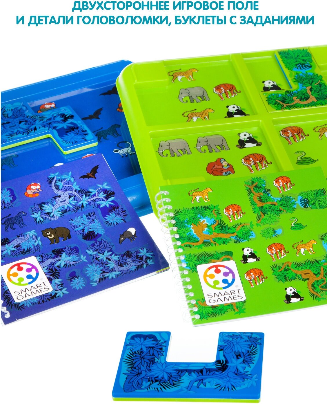 Откройте для себя новый мир животных джунглей! Можете ли вы спрятать всех животных в джунглях кроме тех, которые показаны в вашем задании? Благодаря 80 заданиям и двухстороннему игровому полю, вы получаете две игры в одной: день в джунглях, когда игровое поле разделено на 4 области, и ночь в джунглях, с более сложными заданиями на одном большом игровом пространстве.