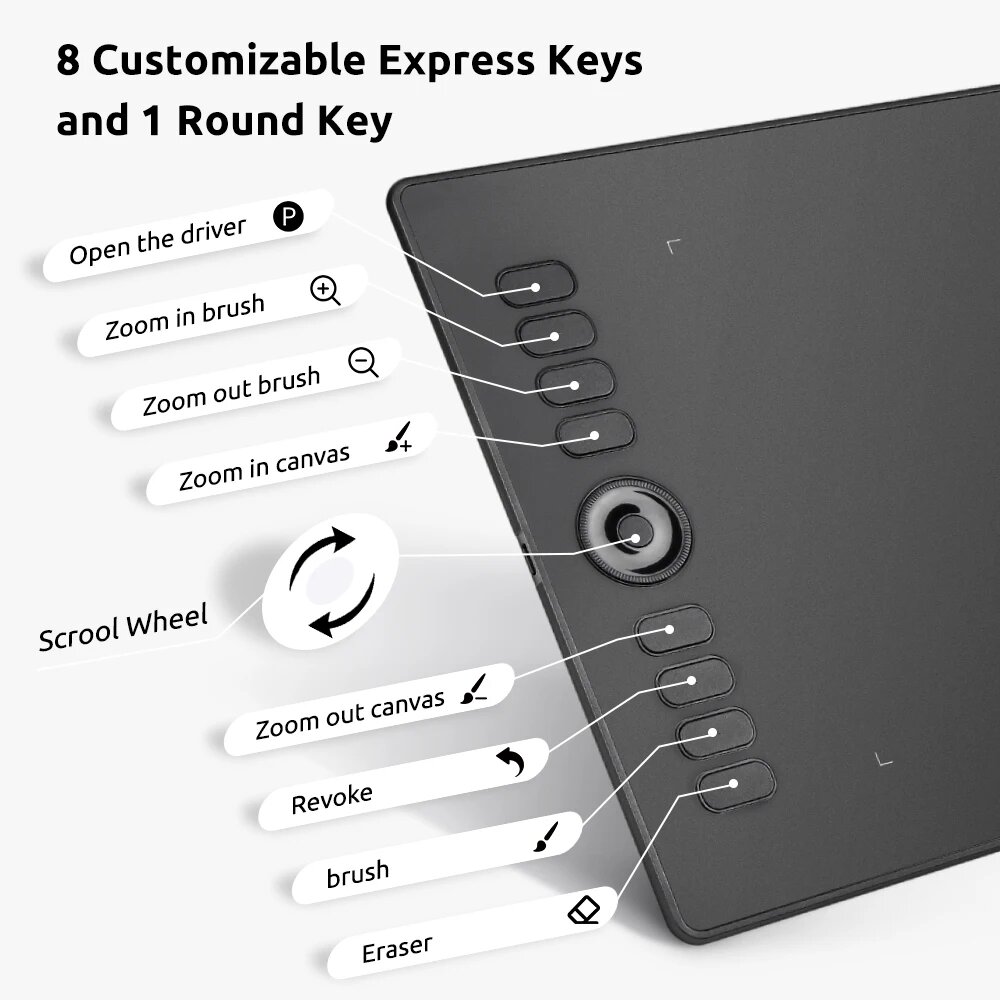 | Особенности | аналоговое колесо, 8 горячих клавиш, 2 клавиши на стилусе |