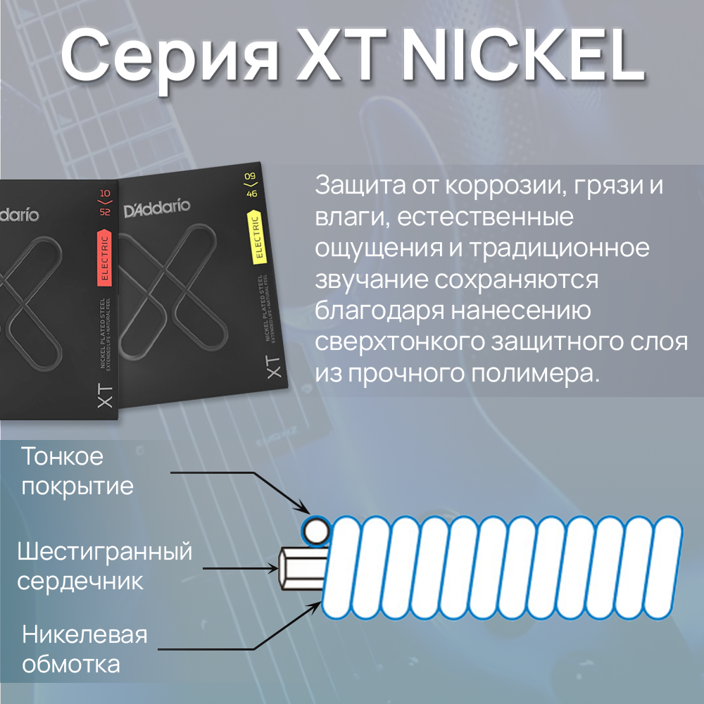 XT серия – это первые струны D'Addario, сочетающие в себе керн из фирменного сплава высокоуглеродистой стали и струны без обмотки из стальной проволоки с супертонким защитным напылением на всех струнах комплекта. Струны обладают увеличенным сроком службы, повышенной прочностью, стабильностью строя, сохраняя при этом ощущения и звучание, характерные для струн без напыления. Исследования показали, что струны серии XT на 42% крепче и на 131% стабильнее обычных струн.