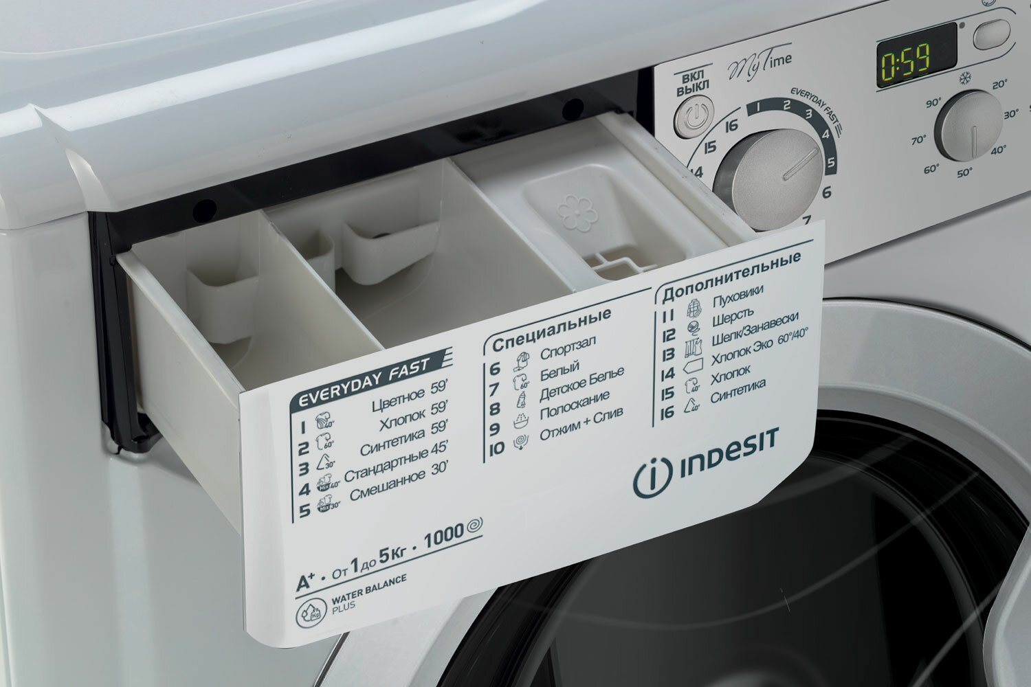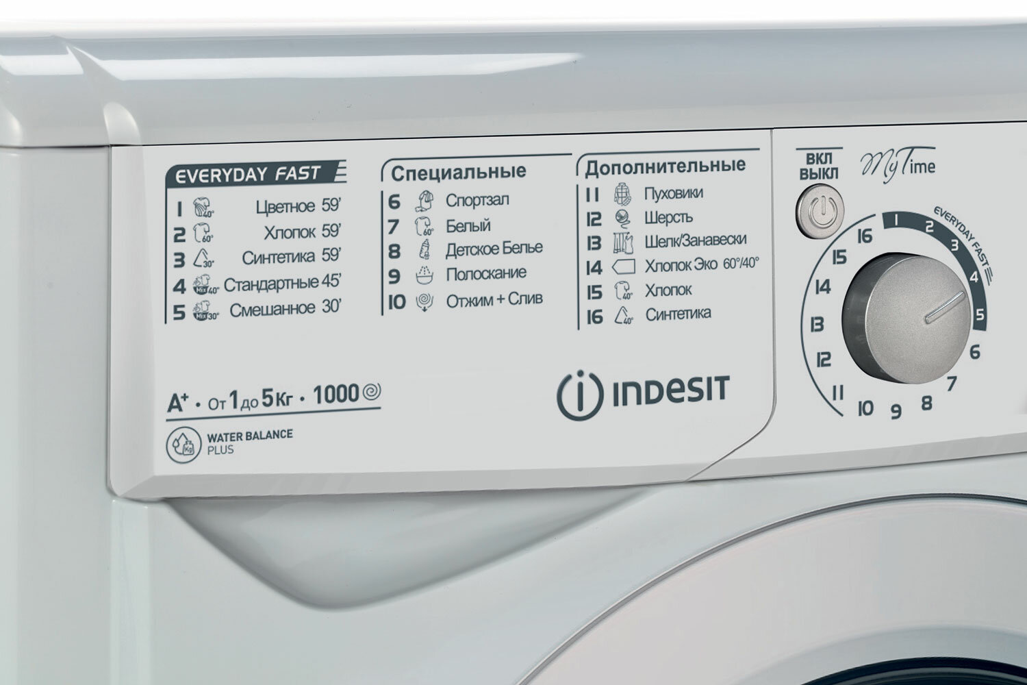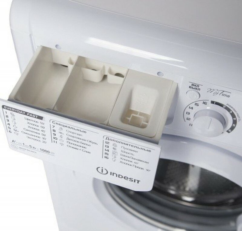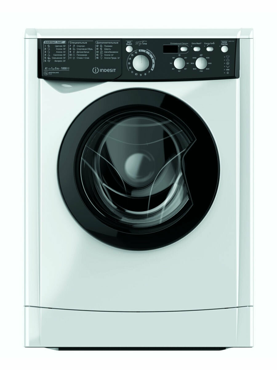 Indesit – узкая стиральная машина с загрузкой в 5 кг белья. Глубина корпуса – всего 42 см, поэтому прибор поместится в небольшой ванной.