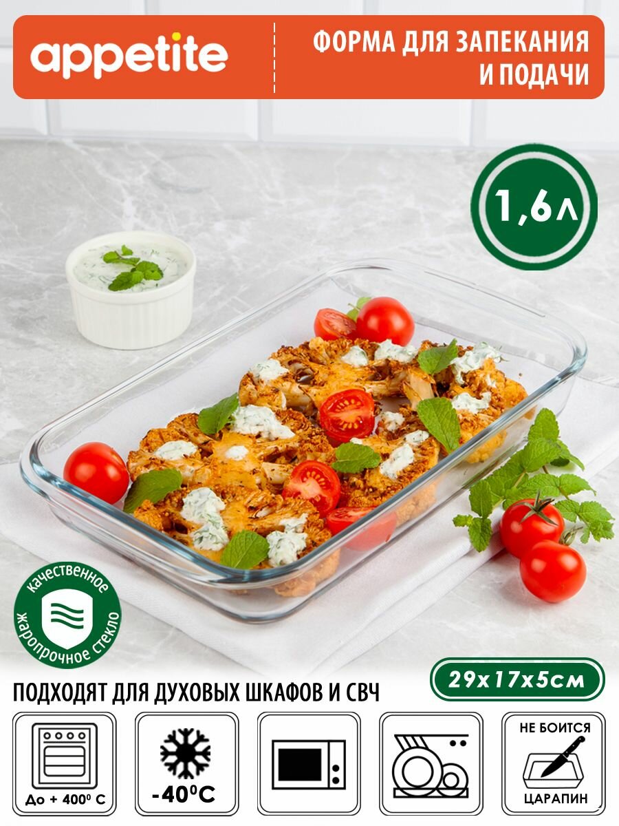 Форма TM Appetite изготовлена из жаропрочного стекла, которое выдерживает температуру до +400°С. Форма не вступает в реакцию с готовящейся пищей, не выделяет вредных веществ и не подвергается воздействию кислот и солей. Материал изделия гигиеничен прост в уходе и обладает высокой степенью прочности. Благодаря гладкой непористой поверхности форма не впитывает запахи, не меняет цвет, легко моется. Стойкое к образованию царапин. Форма TM Appetite по достоинству оценит даже не профессиональный повар, поскольку благодаря данному атрибуту вы сможете с удовольствием приготовить любимое блюдо в духовом шкафу, сохранив особый аромат и полезные свойства. Предназначена для приготовления, разогрева и хранения пищи, а также для подачи готовых блюд. Можно использовать в духовке, микроволновой печи, холодильнике и морозильной камере. Не подходит для открытого огня. Можно мыть в посудомоечной машине.важно: Изделия из жаропрочного стекла не терпят температурного шока. Холодную посуду нельзя ставить в разогретую духовку. Рекомендуется ставить стеклянную посуду в холодный шкаф. Нагревание и охлаждение изделия должно быть постепенным.