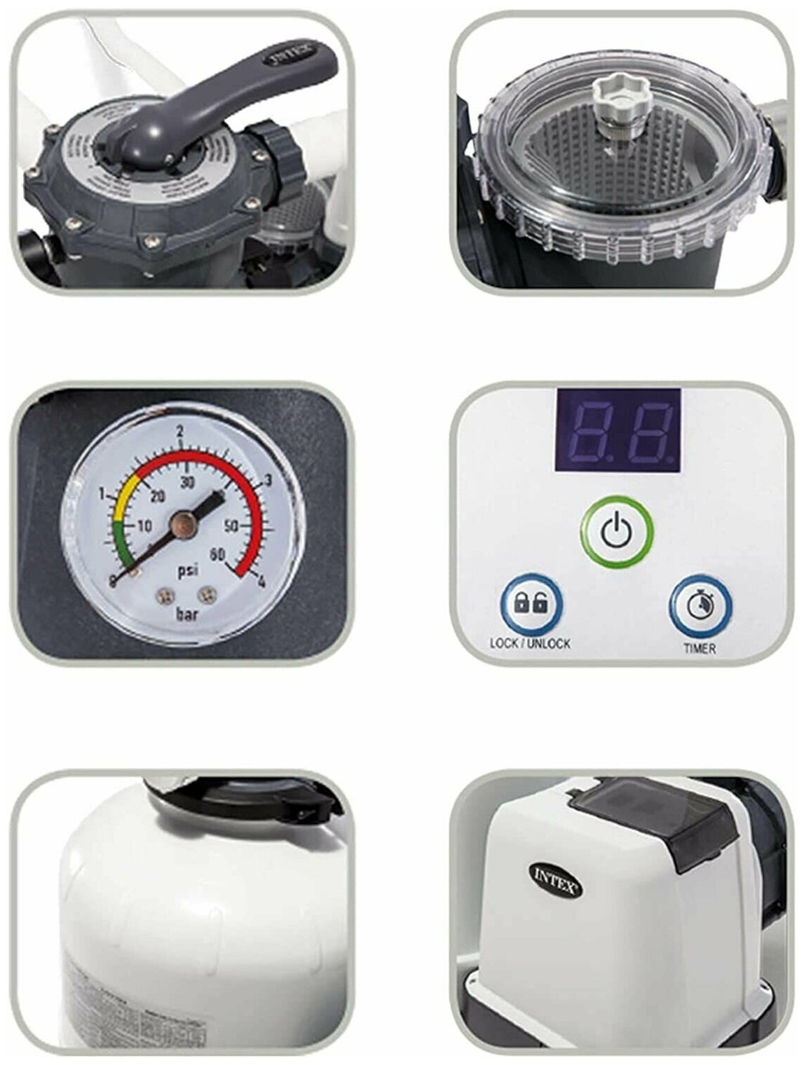 Песочный насос-фильтр Intex Sand Filter Pump - обновленная модель 2019 года. Подходит к бассейнам диаметром от 366 см и до 549 см, а также прямоугольным бассейнам размером до 732x366 см. Песочные насос - фильтры требуют минимального обслуживания. Песок необходимо менять один раз в несколько лет. По сравнению с обычными фильтрующими насосами, использующими сменные фильтры- картриджи и обеспечивающими слабую очистку воды, песочные фильтры очищают воду в 4 раза эффективнее. Насос имеет 6 режимов работы и встроенный 24-часовой таймер, подключается к штатным отверстиям бассейна при помощи двух гофрированных шлангов.