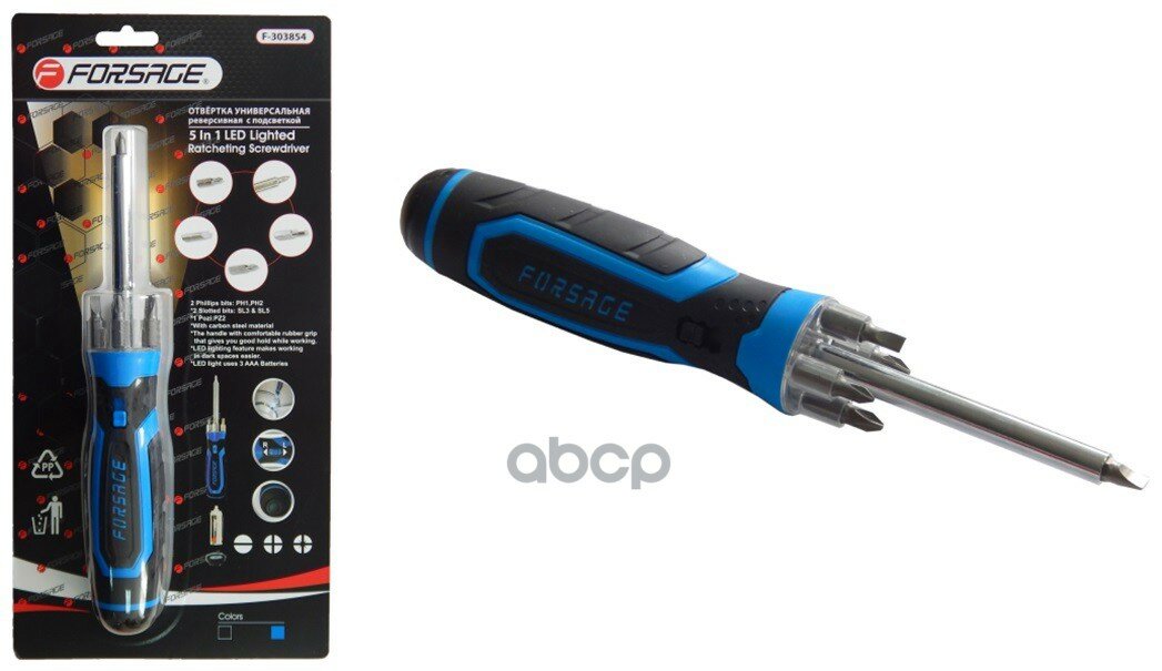 Универсальная реверсивная отвертка с подсветкой 4LED (3AAA) и комплектом бит Forsage L-250мм (PH1, PH2, PZ2, SL5, SL6) предназначена для монтажных, демонтажных и ремонтных работ. Имеет прочный стержень из углеродистой стали. Инструмент относится к профессиональному классу.