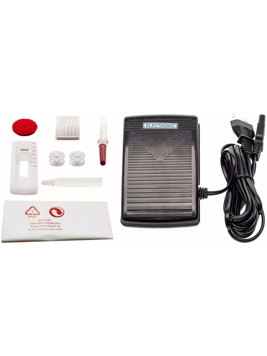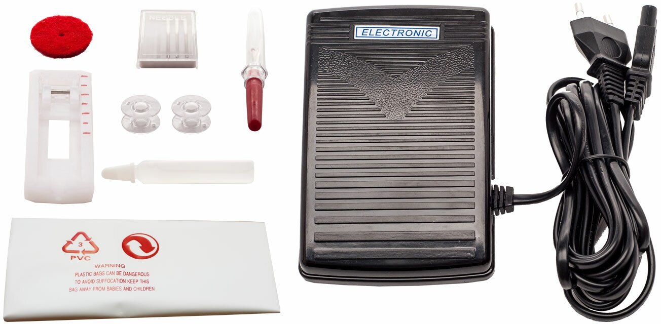 | Комплект поставки | педаль; руководство по эксплуатации; рамка для петли; иглы стандартные; шпульки; распарыватель; лапка универсальная; лапка для обметывания петель; лапка для вшивания молнии |