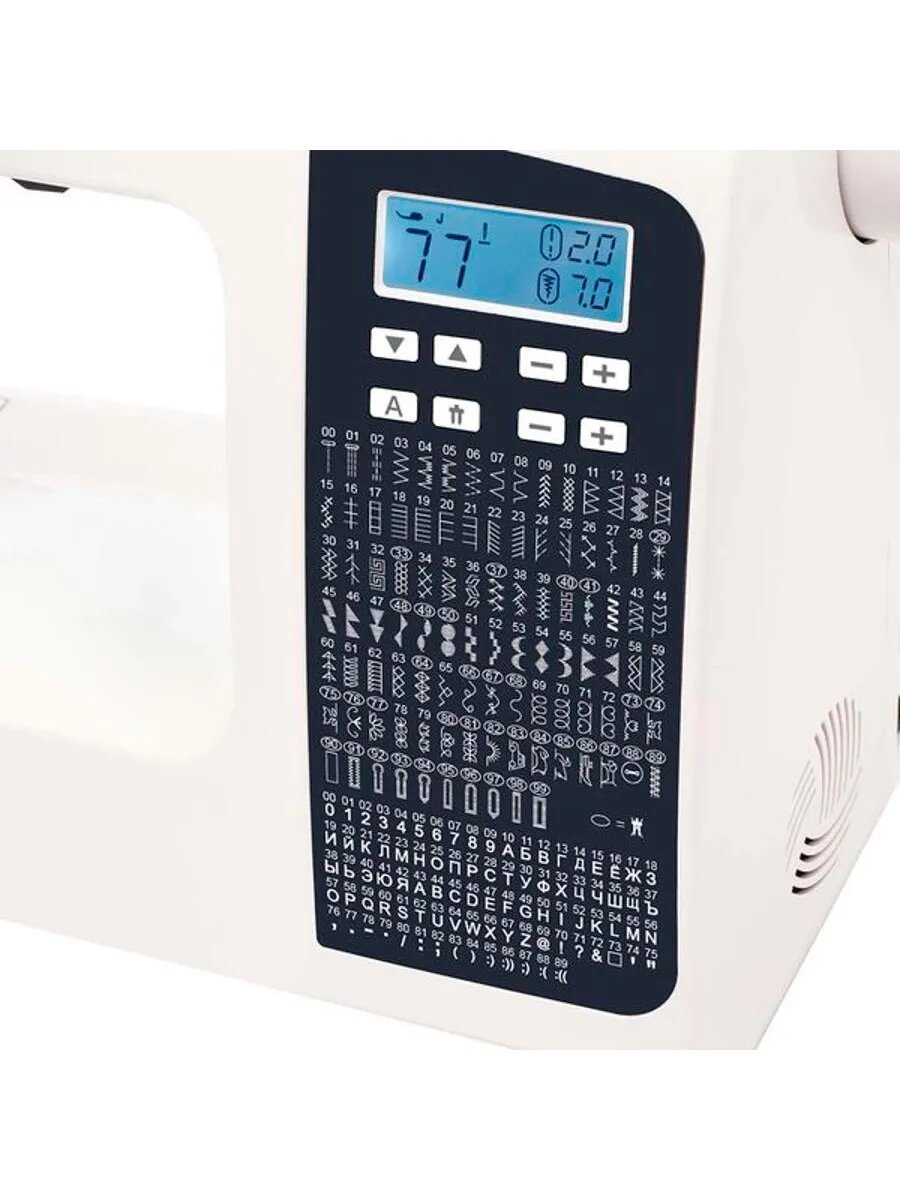 | Дополнительная информация | LED подсветка дисплея, вышивание букв английского и русского алфавитов, вышивка цифры, дополнительный регулятор скорости на корпусе, кнопка шитья без педали, светодиодная подсветка рабочей зоны |