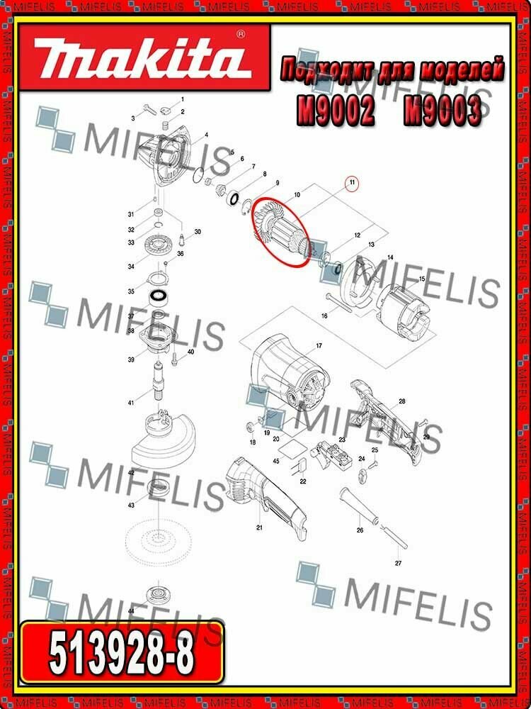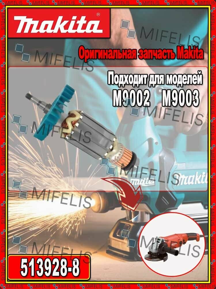 | Прочие особенности и свойства | Спиральный конические шестерни Makita M9003 - для более эффективной передачи энергии;, Компактная и легкая - для высокой производительности при меньших затратах;, Мягкая рукоятка - для комфорта во время работы;, Боковая рукоятка - для удобства оператора;, Триггерный выключатель с кнопкой блокировки - для непрерывной работы;, Блокировка шпинделя - для легкой замены диска;, Внешний доступ к щеткам - для большей работоспособности;, Двойная изоляция - для защиты при случайном касании. |