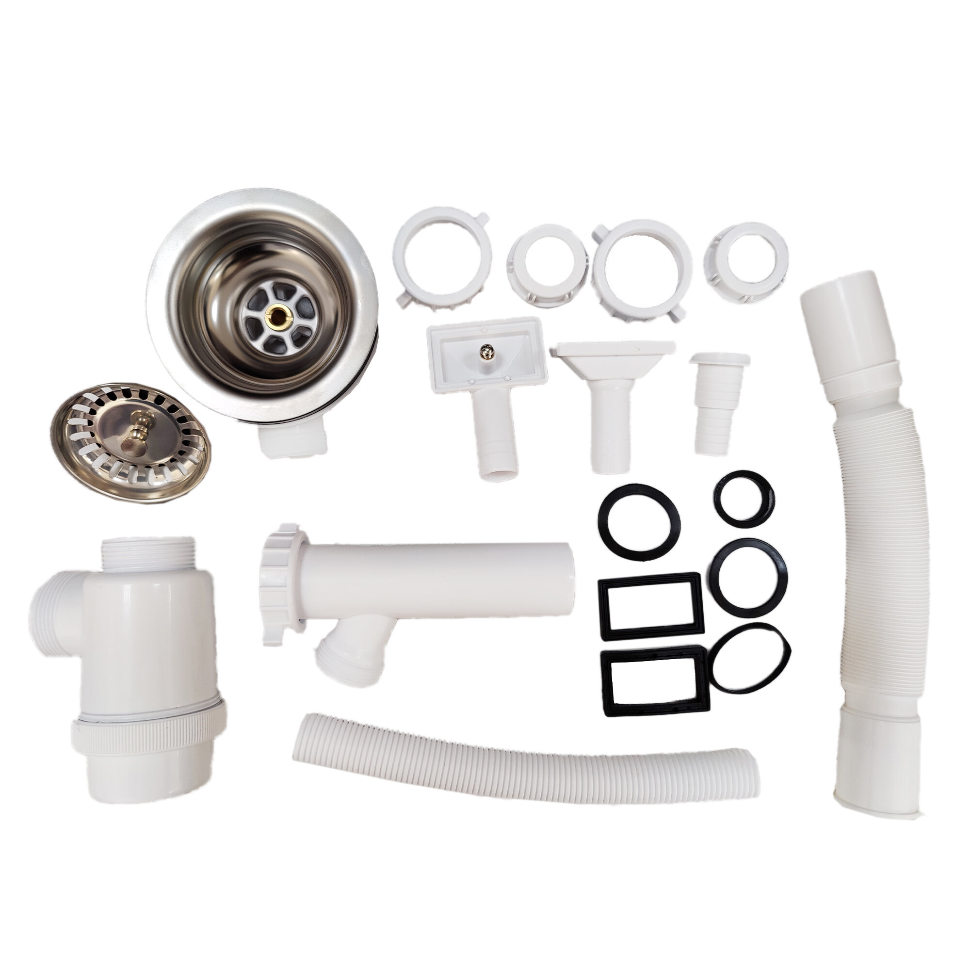 Комплектация выпуска Ukinox : сифон, большой выпуск, боковой перелив, гофросифон, резиновый уплотнитель, металлический шток и винт.