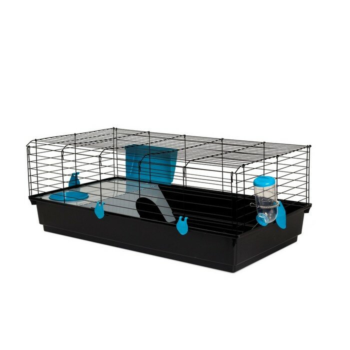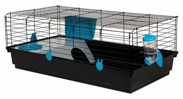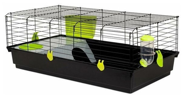 В комплекте поддон, решетка, защелки, домик, сенник, поилка и кормушка.