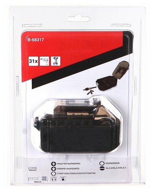 | Особенности | В набор входят битыPH0, PH1, PH2, PH3, PZ0, PZ1, PZ2, PZ3, T10, T15, T20, T25, T27, T30, T40, HEX3, HEX4, HEX5,1 HEX6, SL0.6x4.5, SL0.8x5.5, SL1.2x6.5. Держатель для бит. |