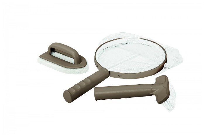 Набор предназначен для качественной чистки Spa-бассейнов Набор состоит из изогнутой щетки, сачка-скиммера, который имеет прочную сетку. С помощью приборов легко можно удалить мелкие частички (листья, ветви) и сильно въевшуюся грязь.