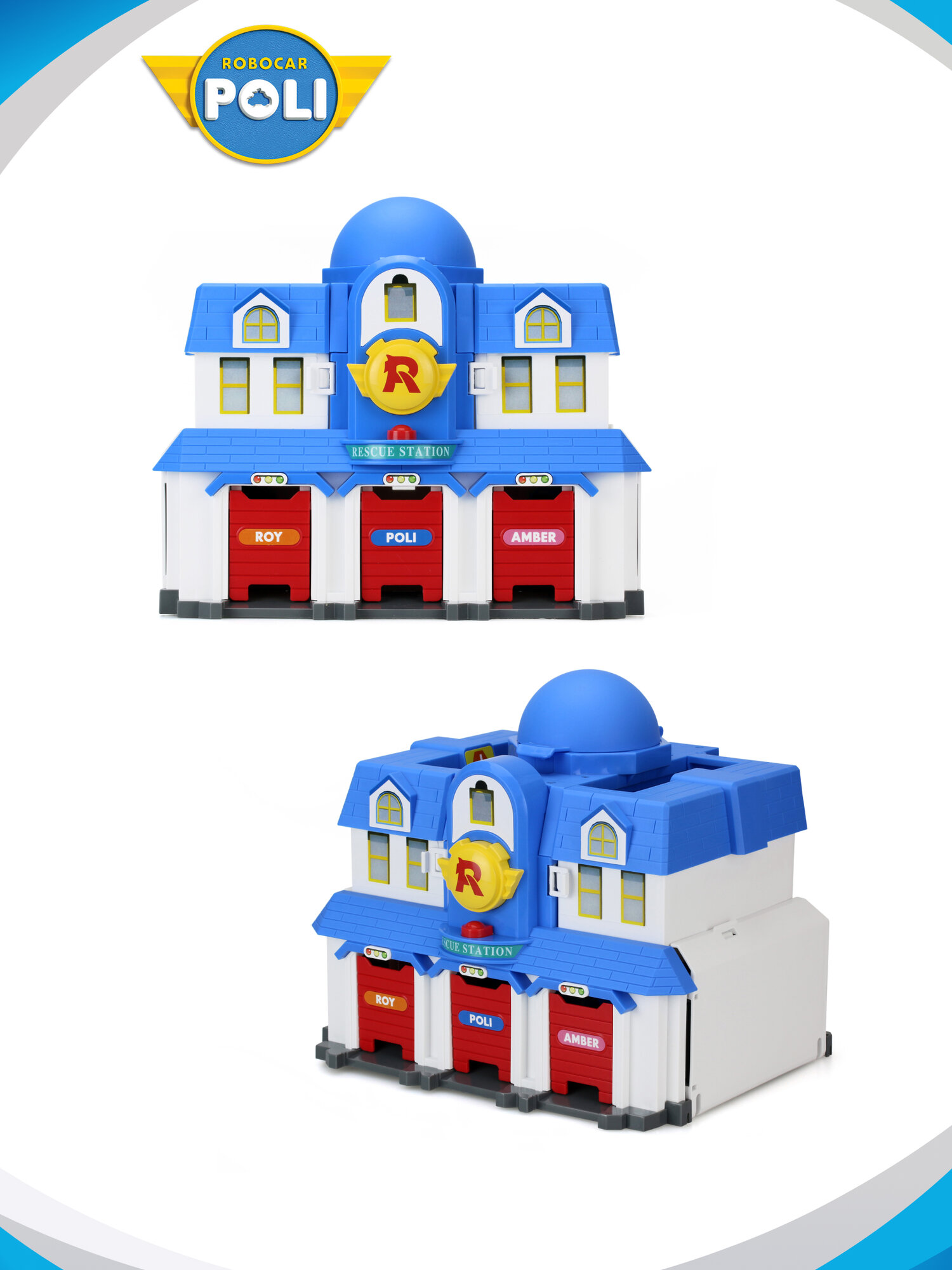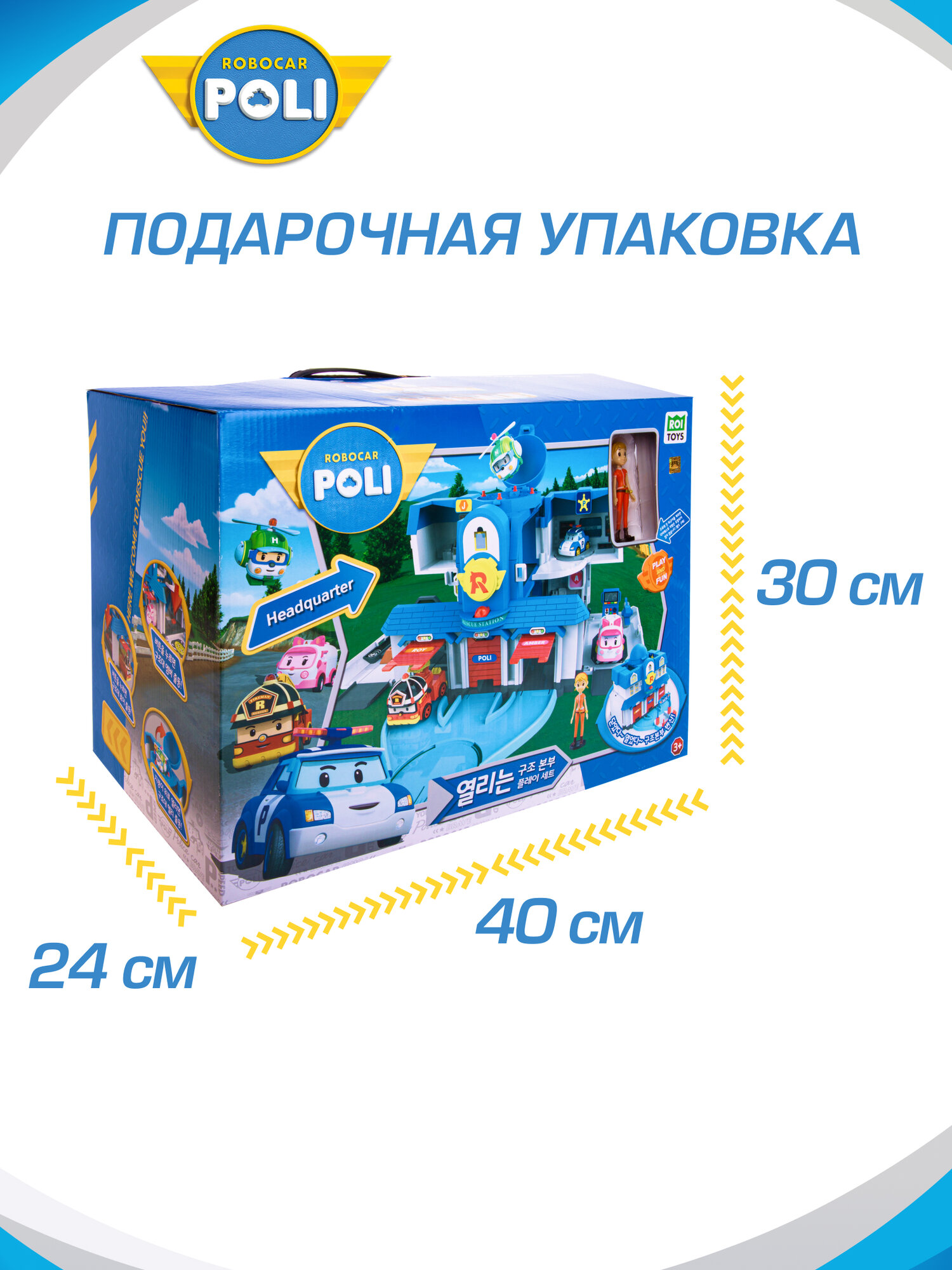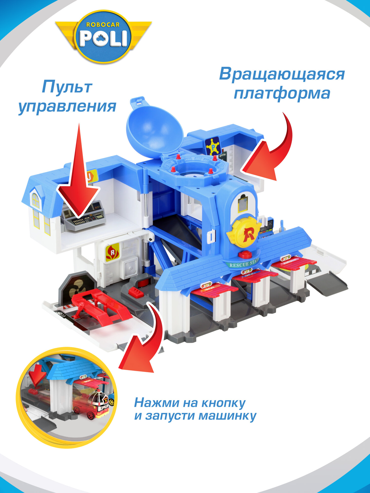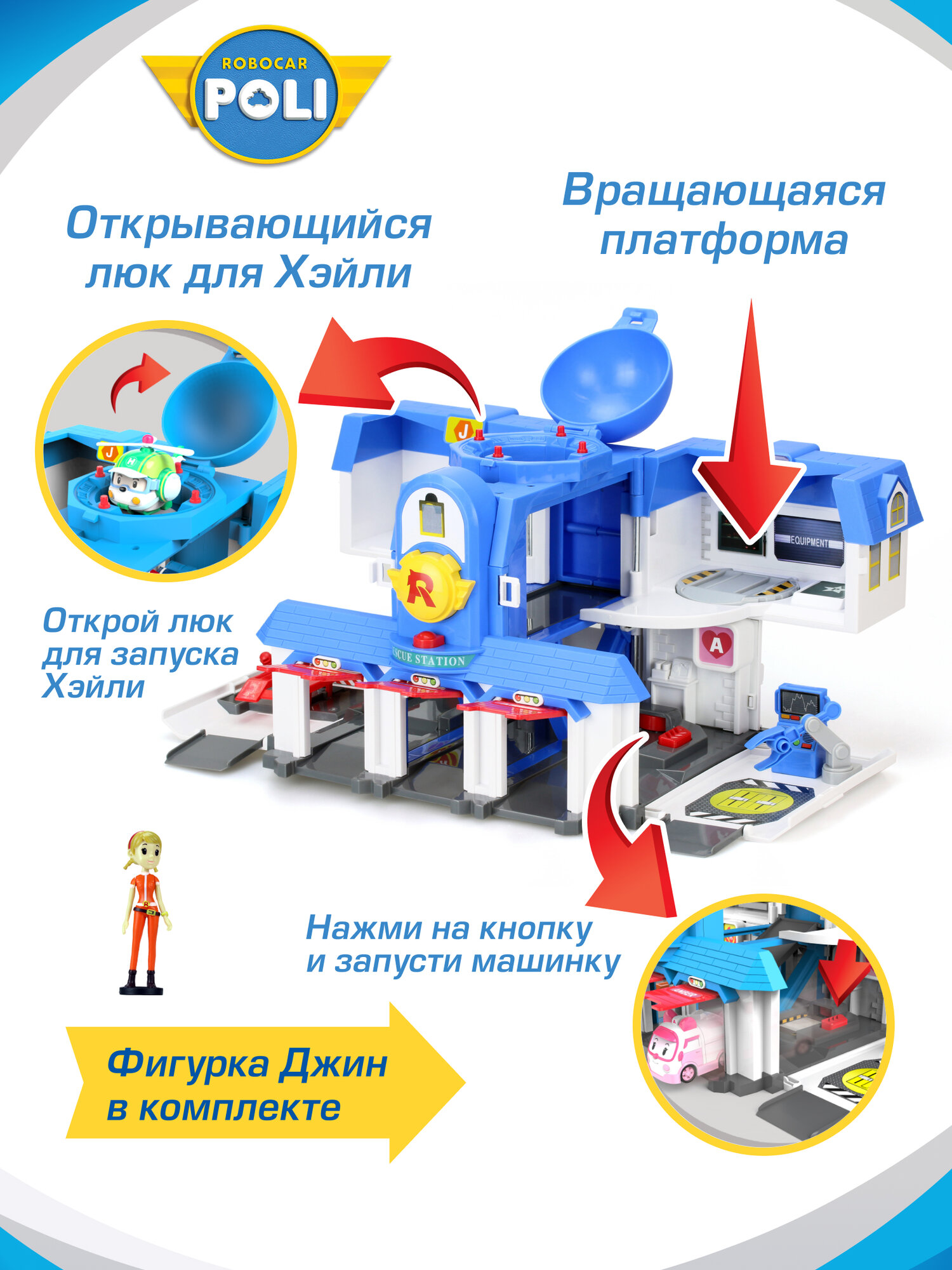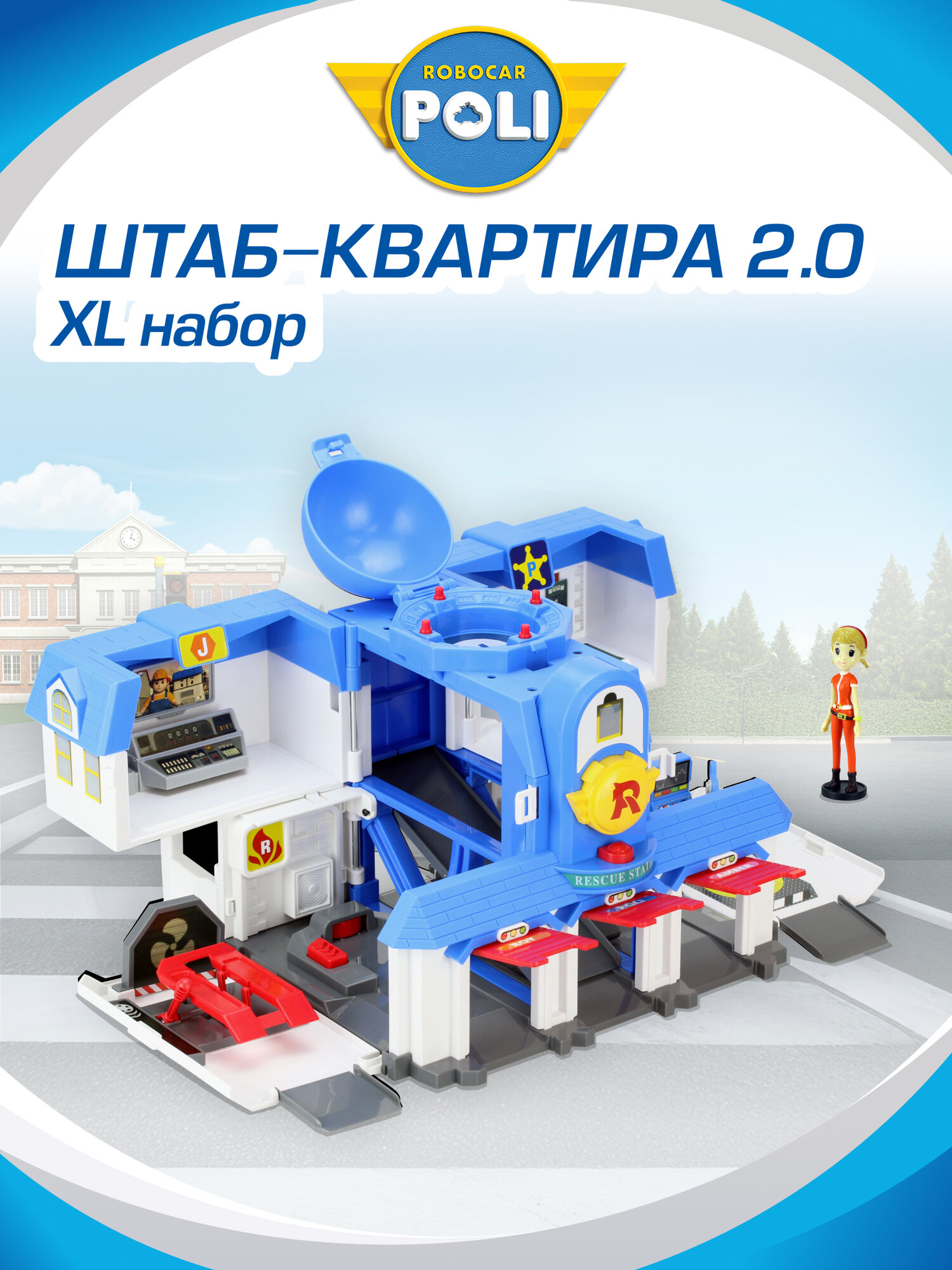 Robocar Poli Игровой набор Штабквартира 2.0 имеет 2 формы. Особенности: Двухэтажное здание с куполом на крыше можно "раскрыть" таким образом, что будут видны внутренний пандус, вертолетная площадка, заправка, диспетчерская и внутренний гараж. Для этого надо лишь опустить боковые стены 1 этажа и раскрыть стены второго. В комплекте также имеется фигурка отзывчивой Джин. Она работает в штаб-квартире диспетчером и любит чинить все подряд.