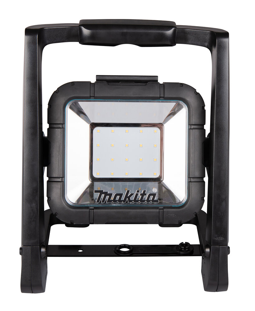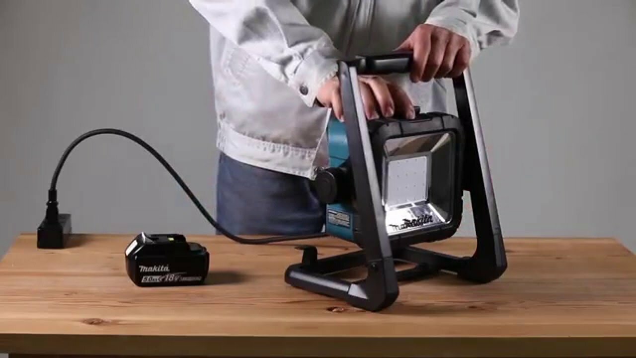 Аккумуляторный прожектор Makita может работать как от аккумуляторных батарей, так и от сети и подходит для использования на строительных площадках и в помещениях, где проводятся ремонтные работы. Он снабжен напольной стойкой, позволяющей регулировать угол освещения в направлении вверх и вниз.