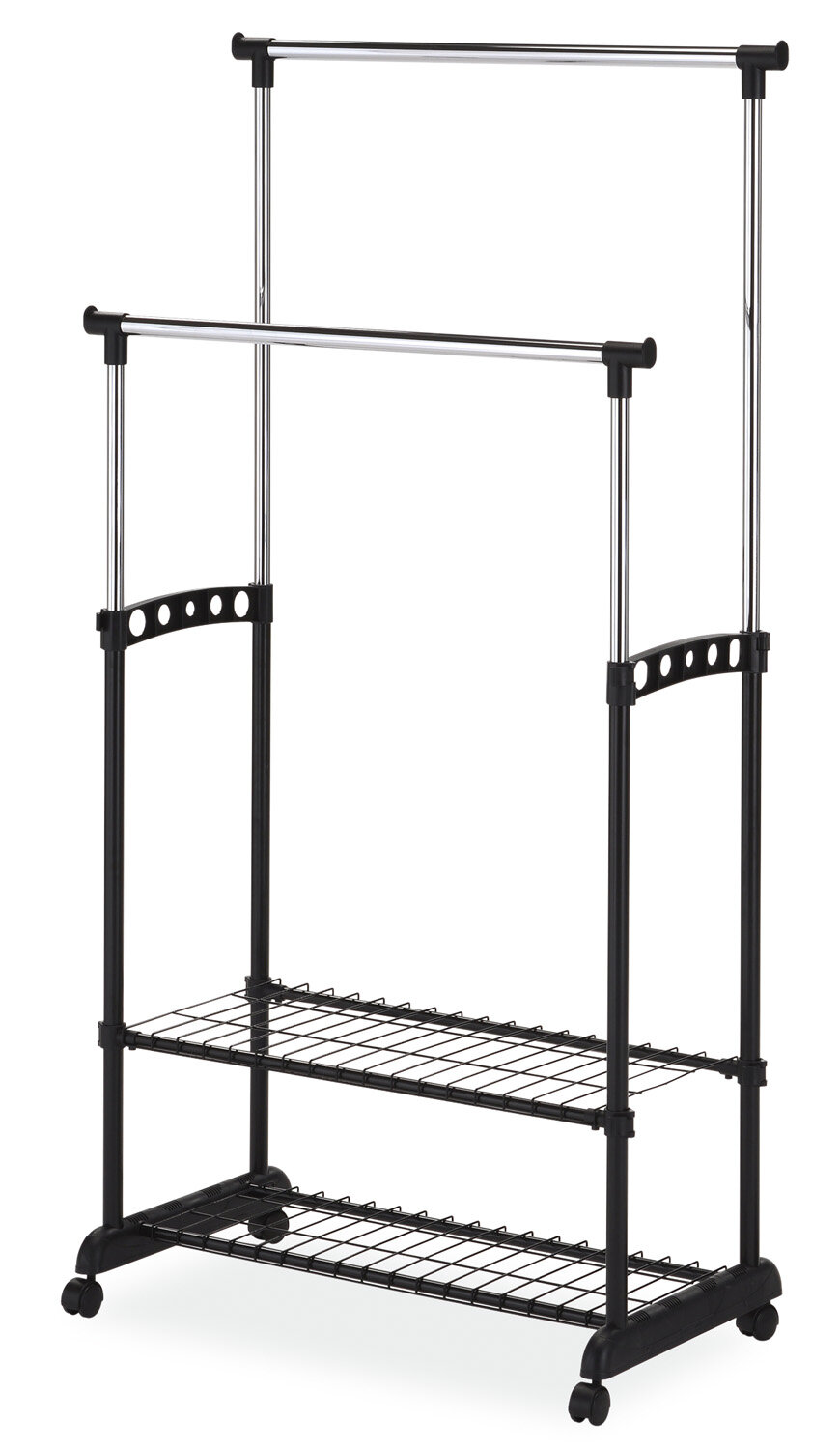 Вешалка для одежды Signal содержит две штанги для размещения верхней одежды, а также две металлические полки, где можно поставить обувь. Модель легко перемещается по комнате благодаря наличию колесиков вместо стационарных ножек.