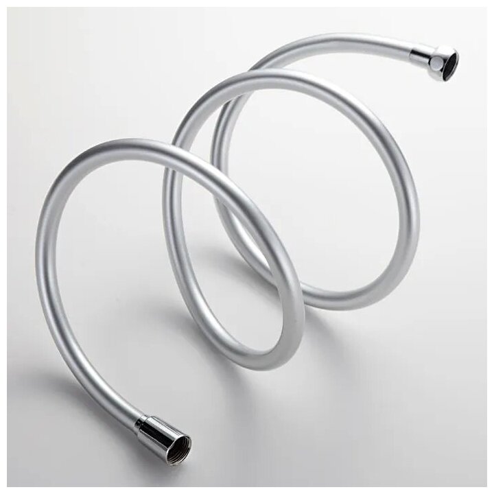 Душевой шланг 150 см для душа оснащен конической поворотной гайкой против перекручивания (360 градусов), используется в качестве гибкой магистрали для подачи воды от корпуса смесителя к душевой лейке. Материал — поливинилхлорид (ПВХ) шланг в оплетке из полистирола, цвет серебристый. Длина 1.5 м