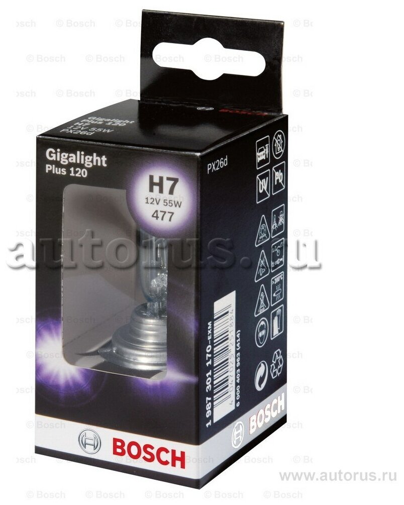 Лампы из серииGigalight Plus 120 – cамые яркие автомобильные лампы от Bosch. Обеспечивают до 120 % больше света на дороге по сравнению со стандартными лампами. Таким образом, они позволяют спокойно и комфортно чувствовать себя без усталости от вождения даже на дальние расстояния и при любых погодных условиях. Дополнительно повышают безопасность дорожного движения.