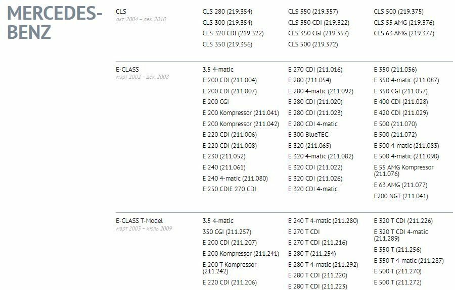 | Модель автомобиля | CLS-Class C219; 2004 – 2011 E-Class W211, седан; 2002 – 2009 |