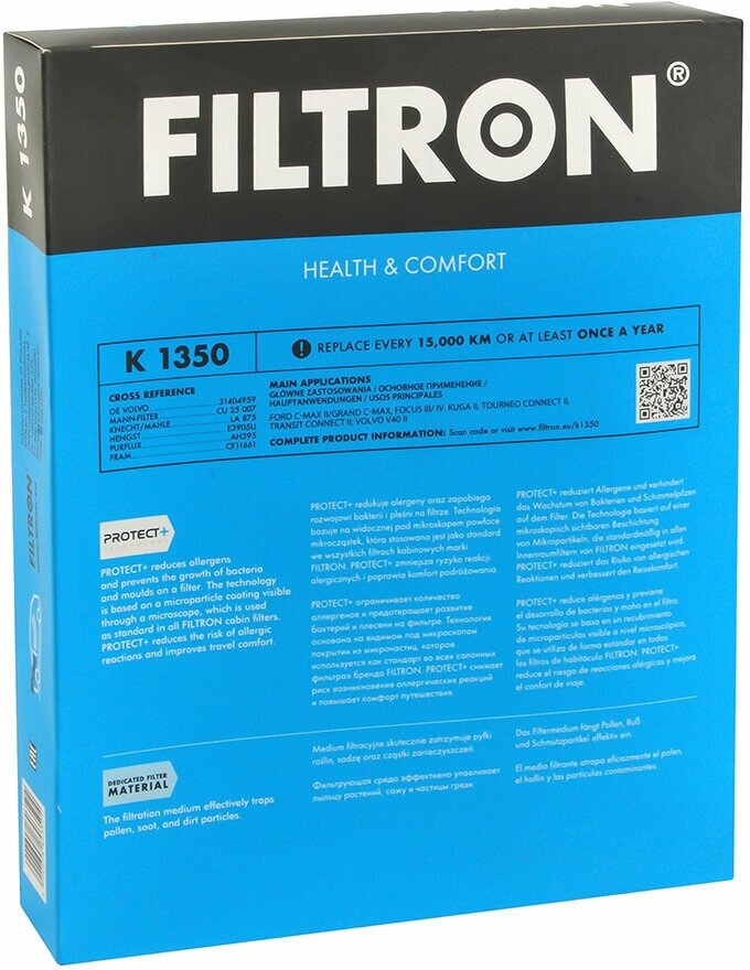 Фильтр салона FILTRON K 1350 для Ford Focus 1.6-2.0 11> изготавливается с помощью высококачественных фильтрующих материалов, которые обладают электростатическими свойствами и, таким образом, способны удерживать даже микроскопические частицы вредных примесей (в несколько десятков раз меньше диаметра человеческого волоса).Дополнительная защита благодаря технологии PROTECT+Технология PROTECT+ уменьшает риск аллергических реакций и защищает пассажиров от аллергенов, бактерий и плесени, которые могут появиться на фильтре. Технология PROTECT+ основана на видимом под микроскопом покрытии из специальных микрочастиц. Эта технология используется в качестве стандартной в каждом фильтре салона FILTRON.Соответственно подобранное количество активированного угляСалонные фильтры с активированным углем, помимо твердых частиц, задерживают вредные газы и запахи. Количество активированного угля в фильтре подбирается таким образом, чтобы фильтр мог долго и эффективно очищать воздух от вредных летучих органических соединений.