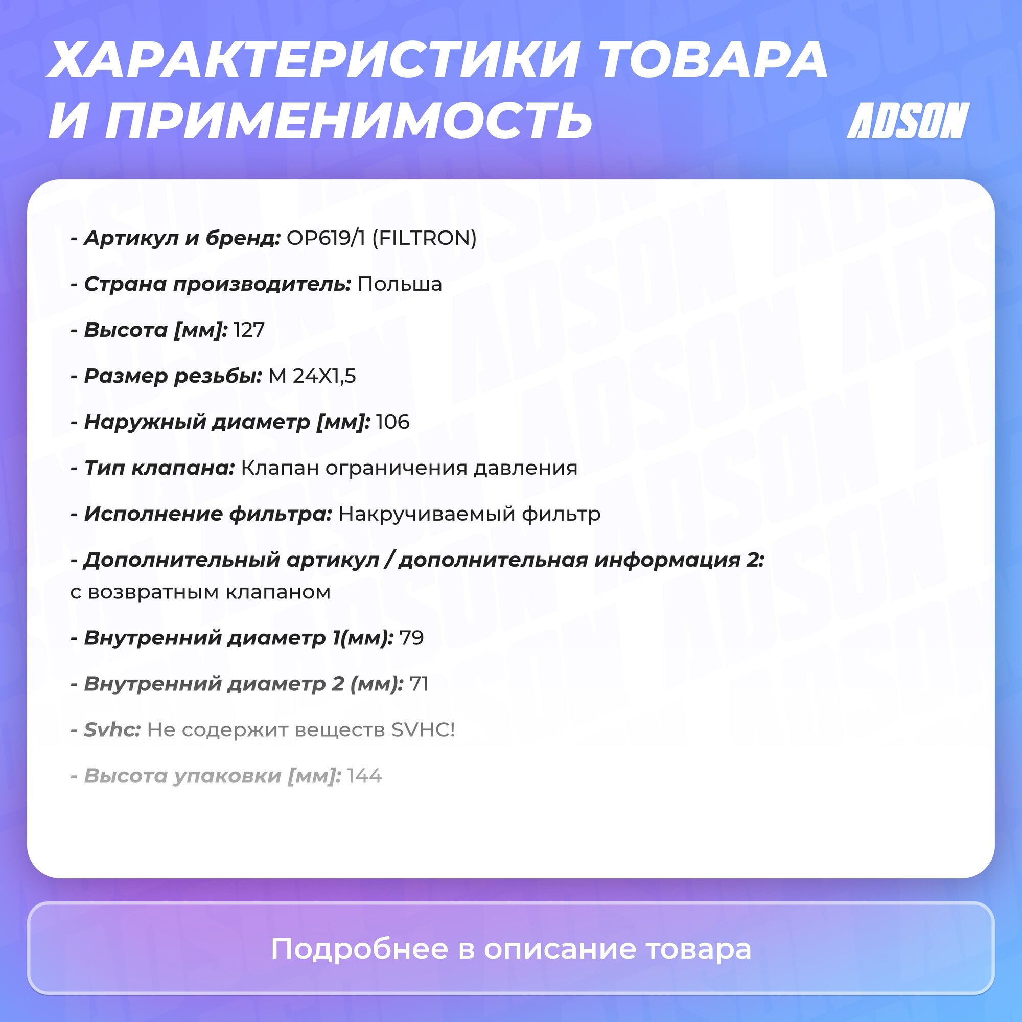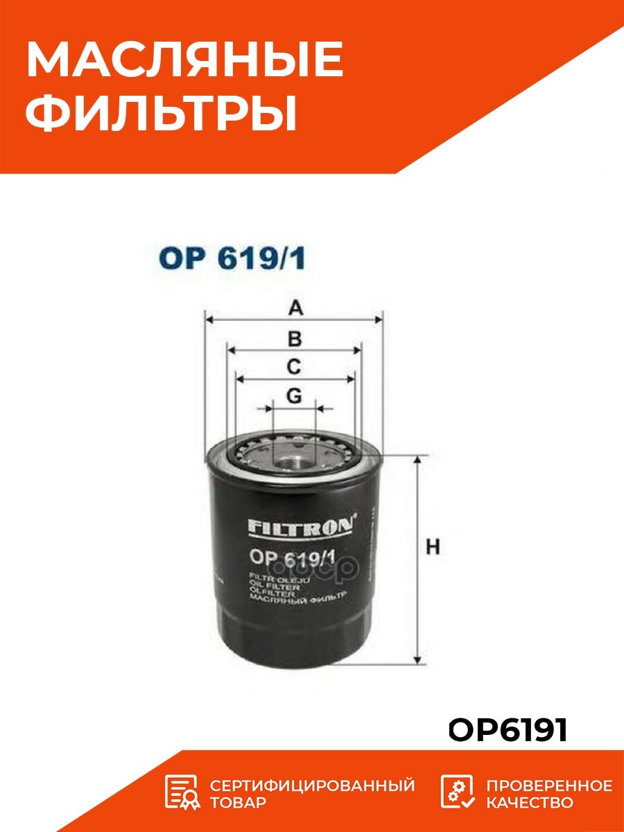 Фильтр масляный FILTRON OP 619/1 для Toyota Hilux/Land Cruiser/Runner, VW Taro 90> изготовлен из материалов высокого качество, которое контролируется лабораторными исследованиями. Фильтрующие среды, а также клапаны, пружины, корпуса или другие элементы фильтров соответствуют требованиям, предъявляемым им даже в самых тяжелых условиях эксплуатации.Проверенная герметичностьВ процессе производства специалисты проводят многочисленные испытания на герметичность масляных фильтров, обладающих корпусом. Испытания проводятся с использованием современных и автоматизированных измерительных машин. Покупая масляный фильтр FILTRON, вы можете быть уверены в том, что его конструкция исключает риск утечки масла.Прецизионные клапаны, учитывающие все требованияB масляных фильтрах корпусного типа с клапанами важно, чтобы конструкция и свойства клапанов соответствовали требованиям изготовителя двигателя или транспортного средства. Клапаны в масляных фильтрах FILTRON разработаны с учетом индивидуальных требований так, чтобы фильтр всегда надёжно выполнял свою задачу в масляной системе.Использование современных синтетических материаловЗамена металлических элементов масляного фильтра элементами, изготовленными из синтетических материалов – это широко применяемая тенденция в фильтрационной отрасли, вызванная желанием облегчить утилизацию фильтра и уменьшить его массу. Стоит отметить, что используемые синтетические материалы тщательно тестируются в лаборатории, поэтому их качество всегда соответствует предъявляемым к ним требованиям.