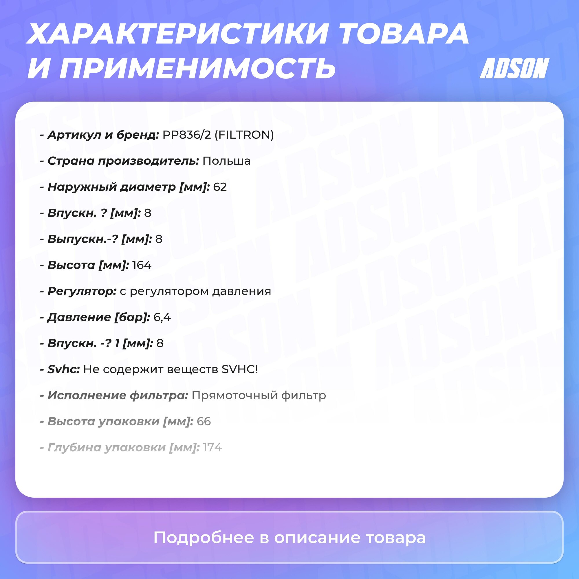 Фильтр топливный FILTRON PP 836/2 для Audi A3, Seat Altea/Leon, Skoda Octavia, VW Eos 1.4/1.6/2.0 03> обеспечивает тщательная и эффективную фильтрацию, задерживая мельчайшие примеси, которые в несколько десятков раз меньше песчинок. Высокое качество фильтров FILTRON обусловлено опытом и современными стандартами производства.Защита современных систем впрыскаИспользуемые в дизельных двигателях системы впрыска требуют очень эффективной фильтрации и отделения воды. FILTRON предлагает широкий ассортимент топливных фильтров для автомобилей с современными системами впрыска. Эти фильтры соответствуют самым высоким стандартам, благодаря высокотехнологичным решениям, таким как, например, многоступенчатое отделение воды.Фильтрующие материалы, адаптированные к требованиям двигателяВ топливных фильтрах FILTRON применяются высокоэффективные фильтрующие материалы, учитывающие требования изготовителя двигателя или транспортного средства. Эффективность и свойства используемых фильтрующих материалов испытываются в современной лаборатории, в которой ежегодно проводим около 4000 тестов.