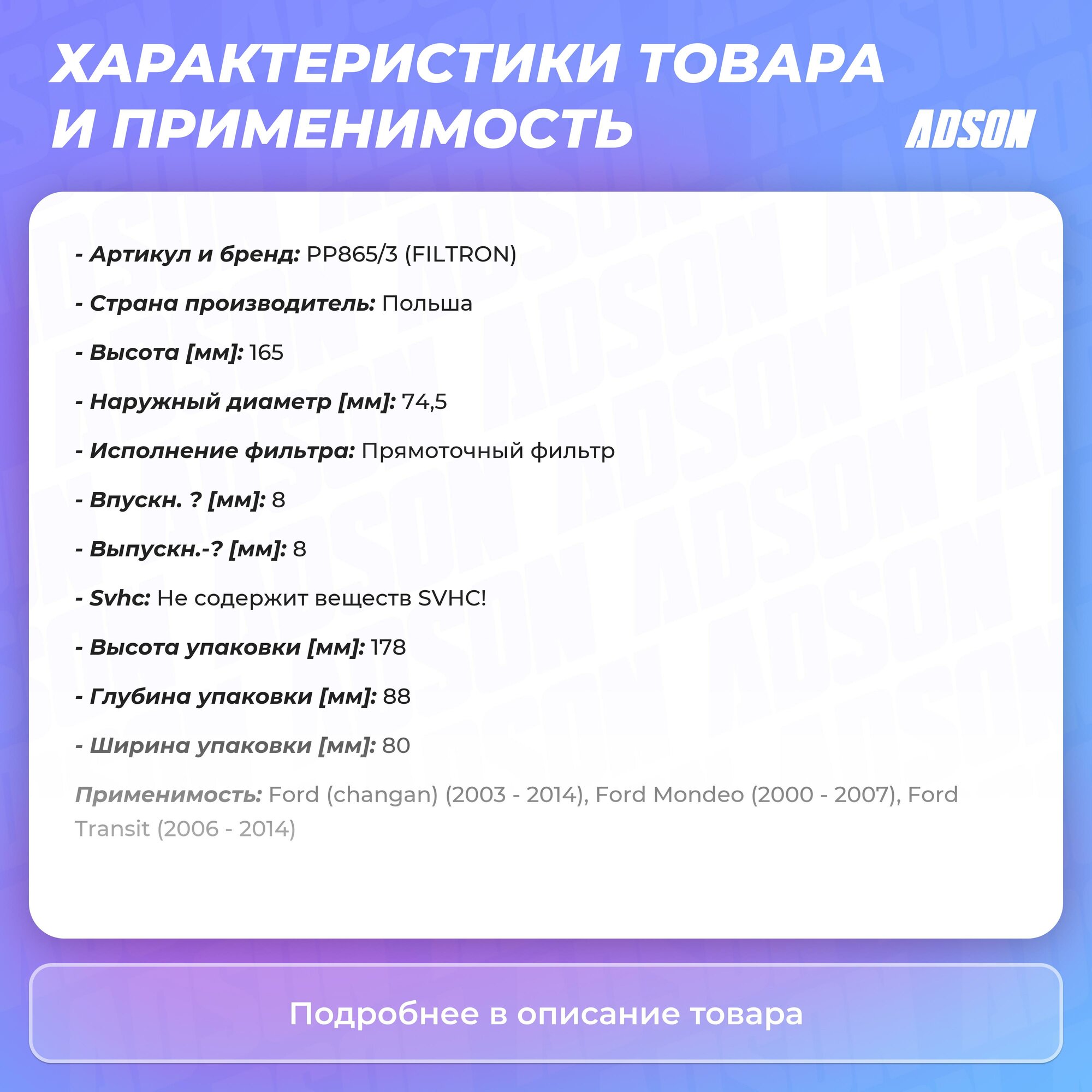 Фильтр топливный FILTRON PP 865/3 для Ford Mondeo 1.8-3.0 00-07> обеспечивает тщательная и эффективную фильтрацию, задерживая мельчайшие примеси, которые в несколько десятков раз меньше песчинок. Высокое качество фильтров FILTRON обусловлено опытом и современными стандартами производства.Защита современных систем впрыскаИспользуемые в дизельных двигателях системы впрыска требуют очень эффективной фильтрации и отделения воды. FILTRON предлагает широкий ассортимент топливных фильтров для автомобилей с современными системами впрыска. Эти фильтры соответствуют самым высоким стандартам, благодаря высокотехнологичным решениям, таким как, например, многоступенчатое отделение воды.Фильтрующие материалы, адаптированные к требованиям двигателяВ топливных фильтрах FILTRON применяются высокоэффективные фильтрующие материалы, учитывающие требования изготовителя двигателя или транспортного средства. Эффективность и свойства используемых фильтрующих материалов испытываются в современной лаборатории, в которой ежегодно проводим около 4000 тестов.