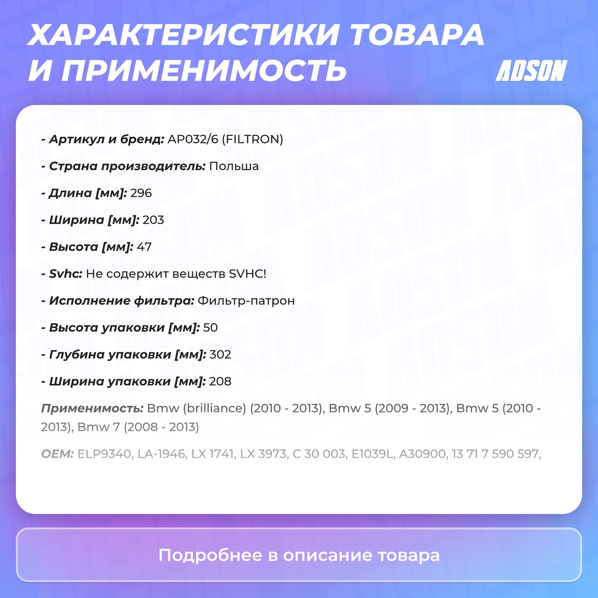 Фильтр воздушный FILTRON для BMW F10 3.0i 11> изготовлен с помощью современных фильтрующих материалов, созданных, в частности, на основе целлюлозных или синтетических волокон. Эти материалы обеспечивают эффективность фильтрации на уровне 99,9% для частиц размером всего в несколько микрон.Фильтрующая среда, стойкая к распространению огняВсе воздушные фильтры марки FILTRON имеют фильтрующие среды, которые, в соответствии с классом горючести F1 или S1, не поддерживают огонь (способствуют самоугасанию пламени) и могут защитить пассажиров от пожара транспортного средства в случае всасывания окурка сигареты в систему подачи воздуха.Прочные прокладки воздушных фильтров, обеспечивающие герметичностьДля производства прокладок воздушных фильтров используется уникальная смесь полиуретана, отличающаяся упругостью и устойчивостью к сжатию в экстремально высоких температурах. Благодаря исключительным свойствам прокладок, воздушные фильтры FILTRON сохраняют герметичность в корпусе даже в очень сложных условиях эксплуатации.Складки стабилизированы с помощью перфорированного покрытияСкладки (гофры) воздушных фильтров FILTRON стабилизируются с помощью специального перфорированного покрытия, предотвращающего слипание соседних складок. Благодаря равномерному распределению складок, воздух фильтруется всей поверхностью фильтрующего материала, способствуя полному использованию мощности двигателя.