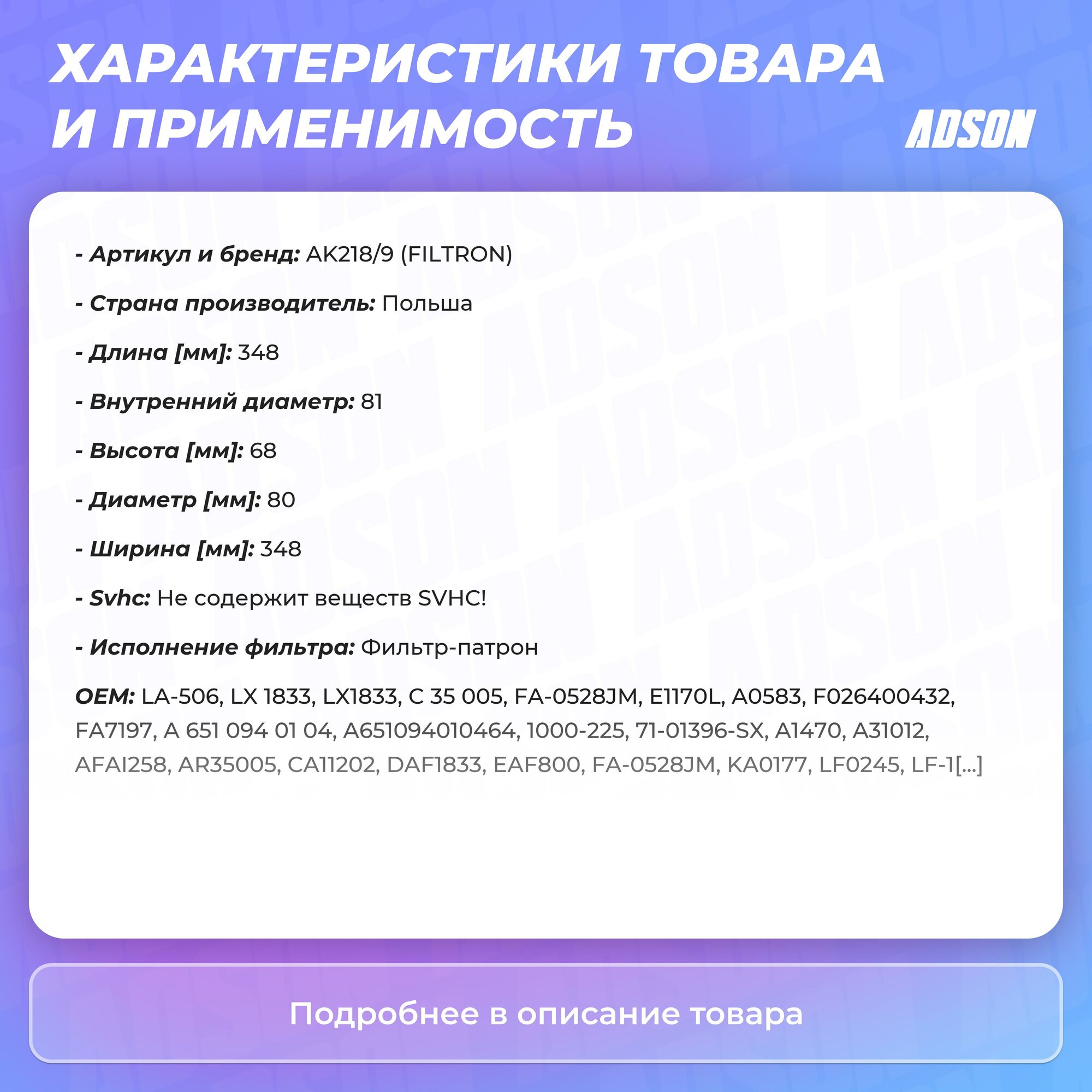 Фильтр воздушный FILTRON AK 218/9 для MB W204/W212/W221 2.2D 11> изготовлен с помощью современных фильтрующих материалов, созданных, в частности, на основе целлюлозных или синтетических волокон. Эти материалы обеспечивают эффективность фильтрации на уровне 99,9% для частиц размером всего в несколько микрон.Фильтрующая среда, стойкая к распространению огняВсе воздушные фильтры марки FILTRON имеют фильтрующие среды, которые, в соответствии с классом горючести F1 или S1, не поддерживают огонь (способствуют самоугасанию пламени) и могут защитить пассажиров от пожара транспортного средства в случае всасывания окурка сигареты в систему подачи воздуха.Прочные прокладки воздушных фильтров, обеспечивающие герметичностьДля производства прокладок воздушных фильтров используется уникальная смесь полиуретана, отличающаяся упругостью и устойчивостью к сжатию в экстремально высоких температурах. Благодаря исключительным свойствам прокладок, воздушные фильтры FILTRON сохраняют герметичность в корпусе даже в очень сложных условиях эксплуатации.Складки стабилизированы с помощью перфорированного покрытияСкладки (гофры) воздушных фильтров FILTRON стабилизируются с помощью специального перфорированного покрытия, предотвращающего слипание соседних складок. Благодаря равномерному распределению складок, воздух фильтруется всей поверхностью фильтрующего материала, способствуя полному использованию мощности двигателя.