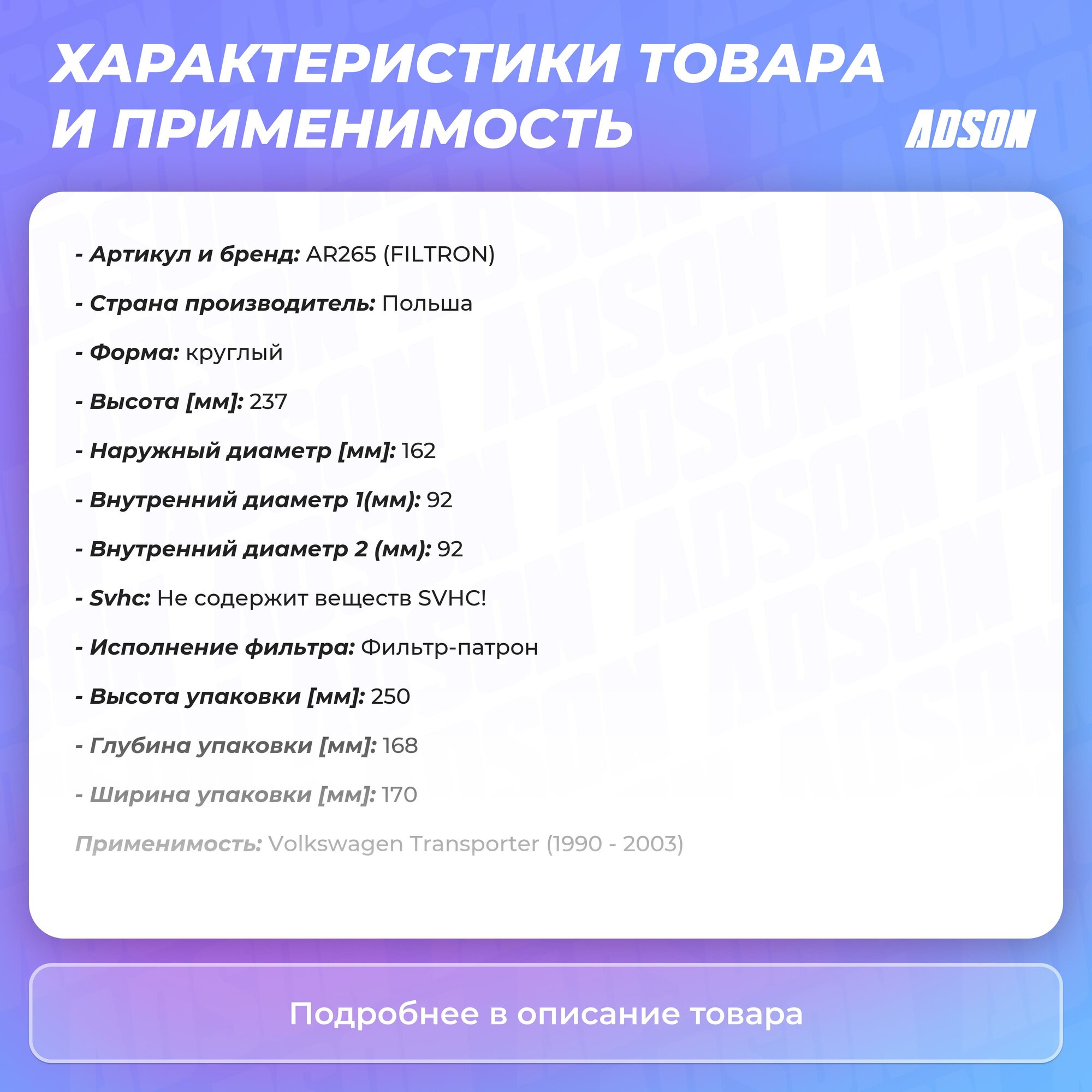 Фильтр воздушный FILTRON AR 265 для VW T4 1.8-1.9D/TD 90> изготовлен с помощью современных фильтрующих материалов, созданных, в частности, на основе целлюлозных или синтетических волокон. Эти материалы обеспечивают эффективность фильтрации на уровне 99,9% для частиц размером всего в несколько микрон.Фильтрующая среда, стойкая к распространению огняВсе воздушные фильтры марки FILTRON имеют фильтрующие среды, которые, в соответствии с классом горючести F1 или S1, не поддерживают огонь (способствуют самоугасанию пламени) и могут защитить пассажиров от пожара транспортного средства в случае всасывания окурка сигареты в систему подачи воздуха.Прочные прокладки воздушных фильтров, обеспечивающие герметичностьДля производства прокладок воздушных фильтров используется уникальная смесь полиуретана, отличающаяся упругостью и устойчивостью к сжатию в экстремально высоких температурах. Благодаря исключительным свойствам прокладок, воздушные фильтры FILTRON сохраняют герметичность в корпусе даже в очень сложных условиях эксплуатации.Складки стабилизированы с помощью перфорированного покрытияСкладки (гофры) воздушных фильтров FILTRON стабилизируются с помощью специального перфорированного покрытия, предотвращающего слипание соседних складок. Благодаря равномерному распределению складок, воздух фильтруется всей поверхностью фильтрующего материала, способствуя полному использованию мощности двигателя.