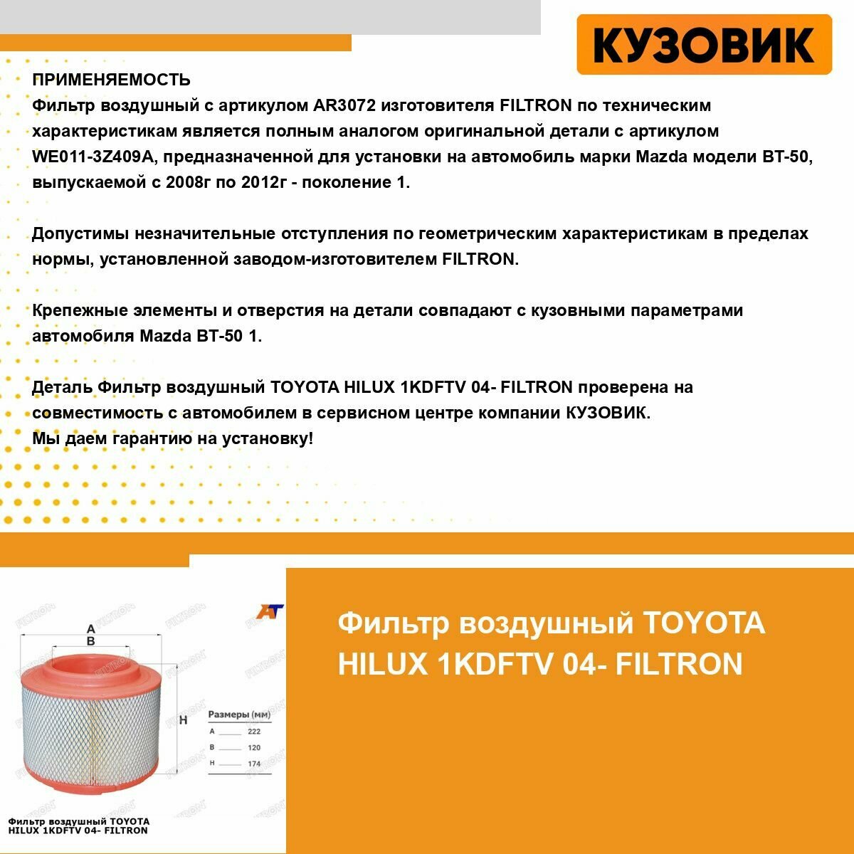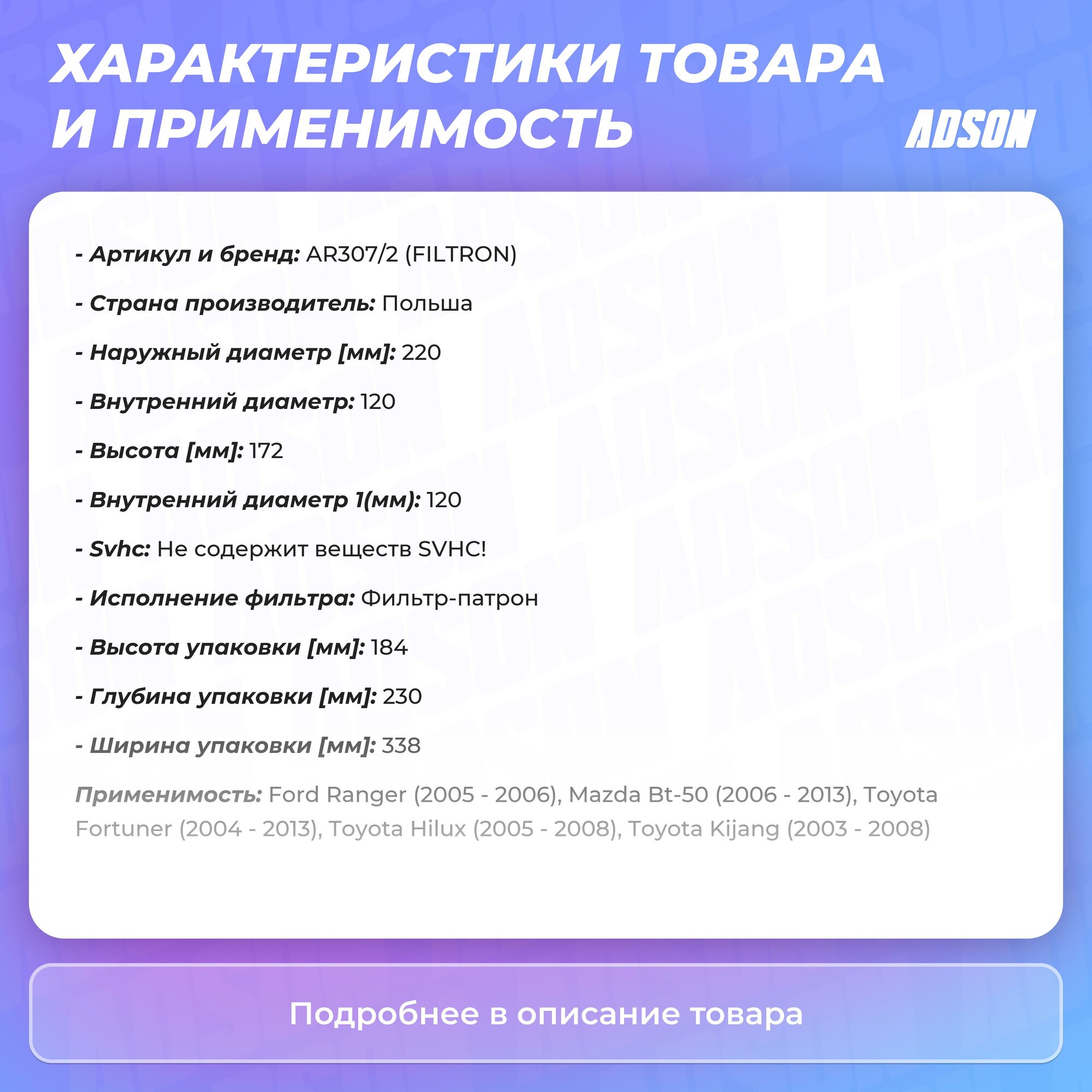 Фильтр воздушный FILTRON AR 307/2 для Ford Ranger 05>, Mazda BT-50 2.5CD 06>, Toyota Hi-Lux 2.5D-3.0D-4D 05> изготовлен с помощью современных фильтрующих материалов, созданных, в частности, на основе целлюлозных или синтетических волокон. Эти материалы обеспечивают эффективность фильтрации на уровне 99,9% для частиц размером всего в несколько микрон.Фильтрующая среда, стойкая к распространению огняВсе воздушные фильтры марки FILTRON имеют фильтрующие среды, которые, в соответствии с классом горючести F1 или S1, не поддерживают огонь (способствуют самоугасанию пламени) и могут защитить пассажиров от пожара транспортного средства в случае всасывания окурка сигареты в систему подачи воздуха.Прочные прокладки воздушных фильтров, обеспечивающие герметичностьДля производства прокладок воздушных фильтров используется уникальная смесь полиуретана, отличающаяся упругостью и устойчивостью к сжатию в экстремально высоких температурах. Благодаря исключительным свойствам прокладок, воздушные фильтры FILTRON сохраняют герметичность в корпусе даже в очень сложных условиях эксплуатации.Складки стабилизированы с помощью перфорированного покрытияСкладки (гофры) воздушных фильтров FILTRON стабилизируются с помощью специального перфорированного покрытия, предотвращающего слипание соседних складок. Благодаря равномерному распределению складок, воздух фильтруется всей поверхностью фильтрующего материала, способствуя полному использованию мощности двигателя.